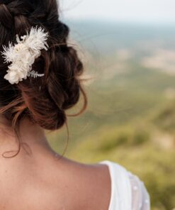 Le peigne de fleurs Mini Nimbe fait partie de la collection Horizon, l’une des nouvelles collections pour les mariages en 2020. Avec cette gamme Horizon, Les Fleurs Dupont ouvrent de nouvelles perspectives à l’accessoire de mariage en fleurs, avec une déclinaison particulièrement contemporaine et fraîche en fleurs stabilisées.