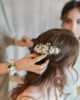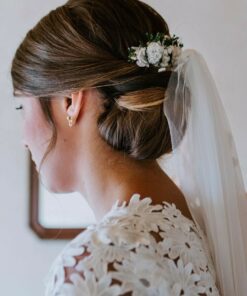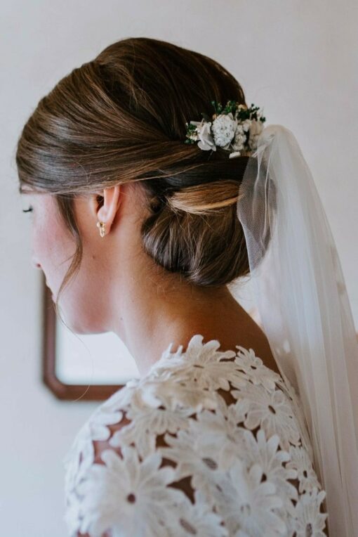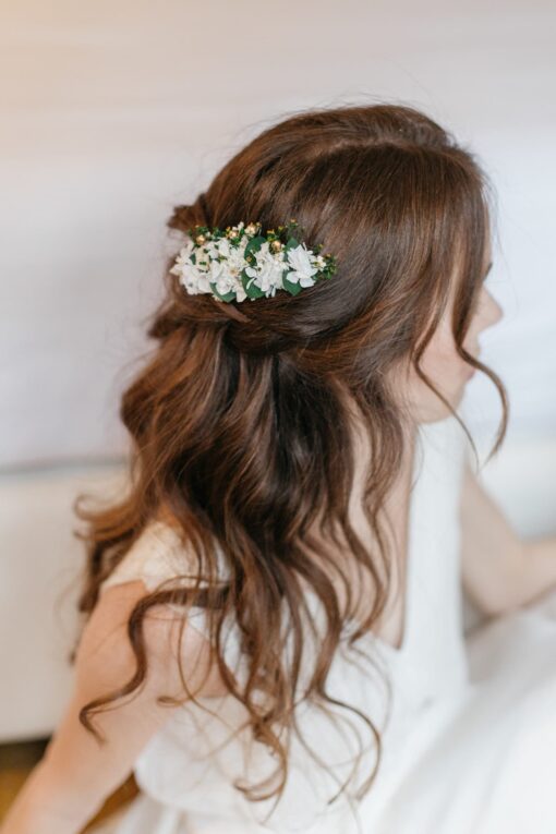 Le peigne de fleurs séchées et stabilisées Minthé se porte facilement et tient seul sur vos cheveux, permettant une multitude de coupes différentes, sublimant notamment un chignon bas, ou encore une queue de cheval.