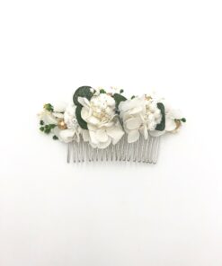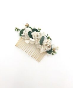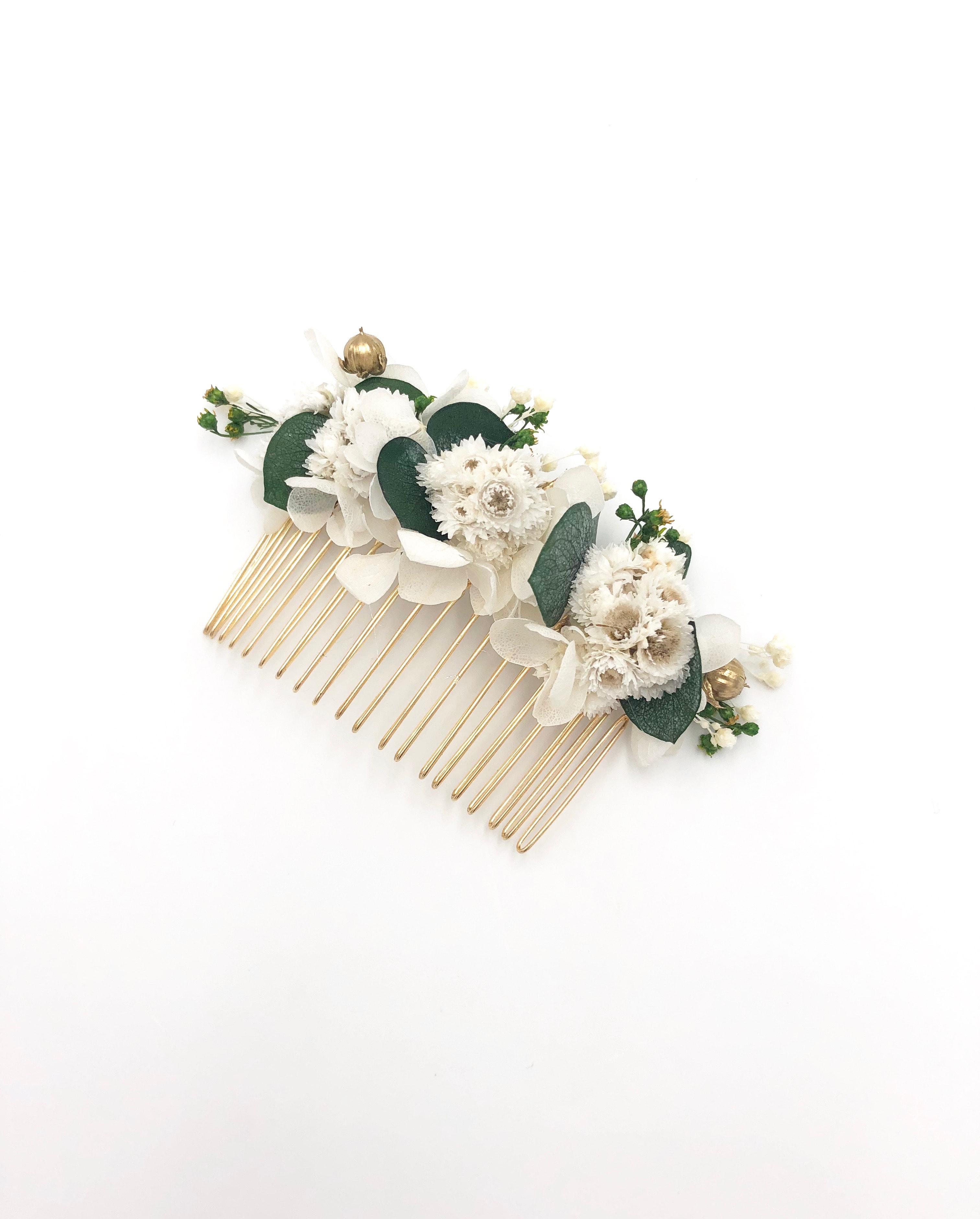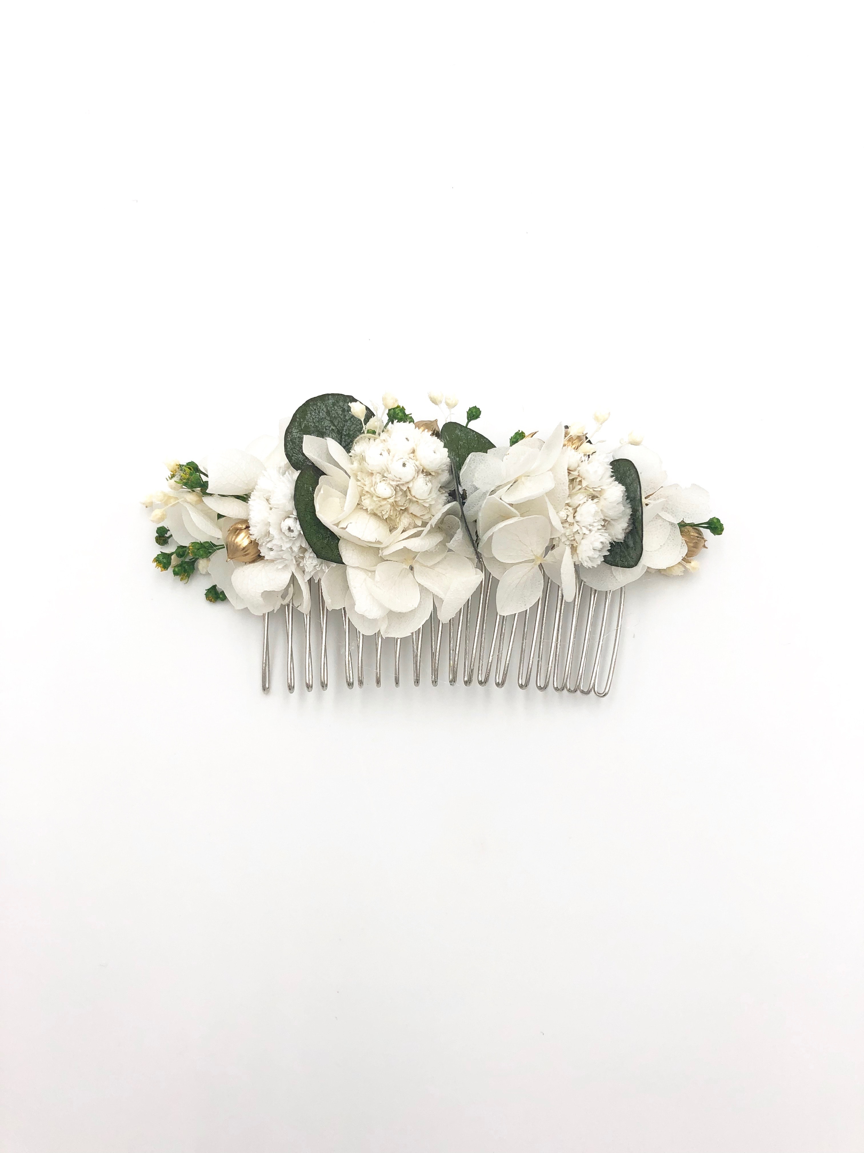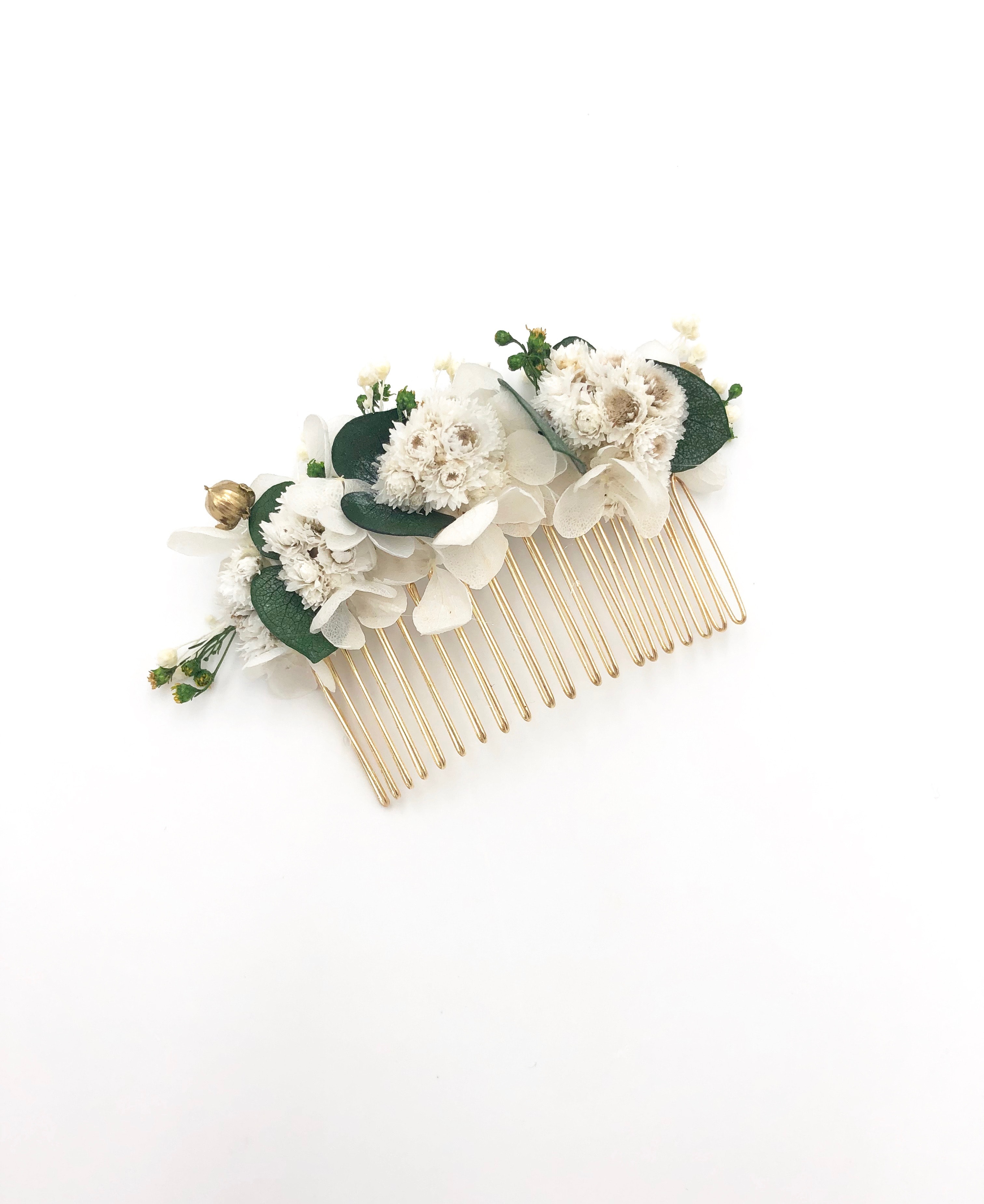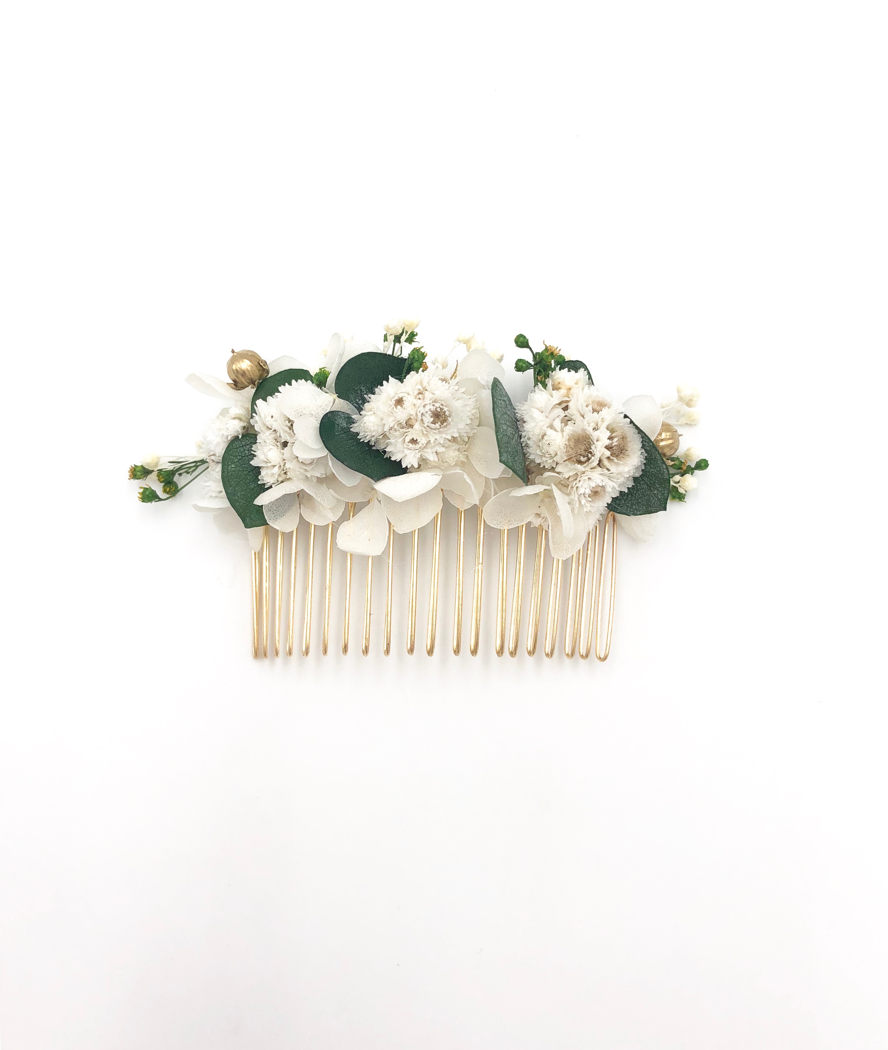 Le peigne de fleurs stabilisées Minthé fait partie de la gamme Minthé et de la collection Végétale. C’est un accessoire qui se veut très frais et élégant, combinant le vert doux de l’eucalyptus baby blue avec l’ivoire des immortelles séchées, le blanc immaculé de petits pétales d’hortensia stabilisée et l’éclat de quelques billes de lin séché doré. Cet accessoire de mariage est un peigne en fleurs séchées (immortelles, lin doré) et en fleurs stabilisées (eucalyptus, hortensia, gypsophile).