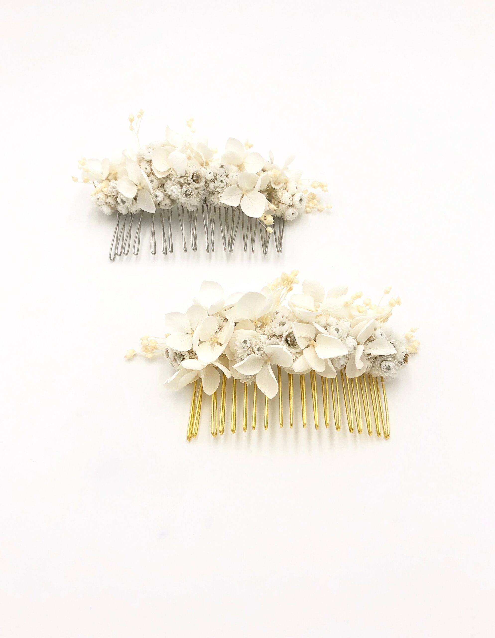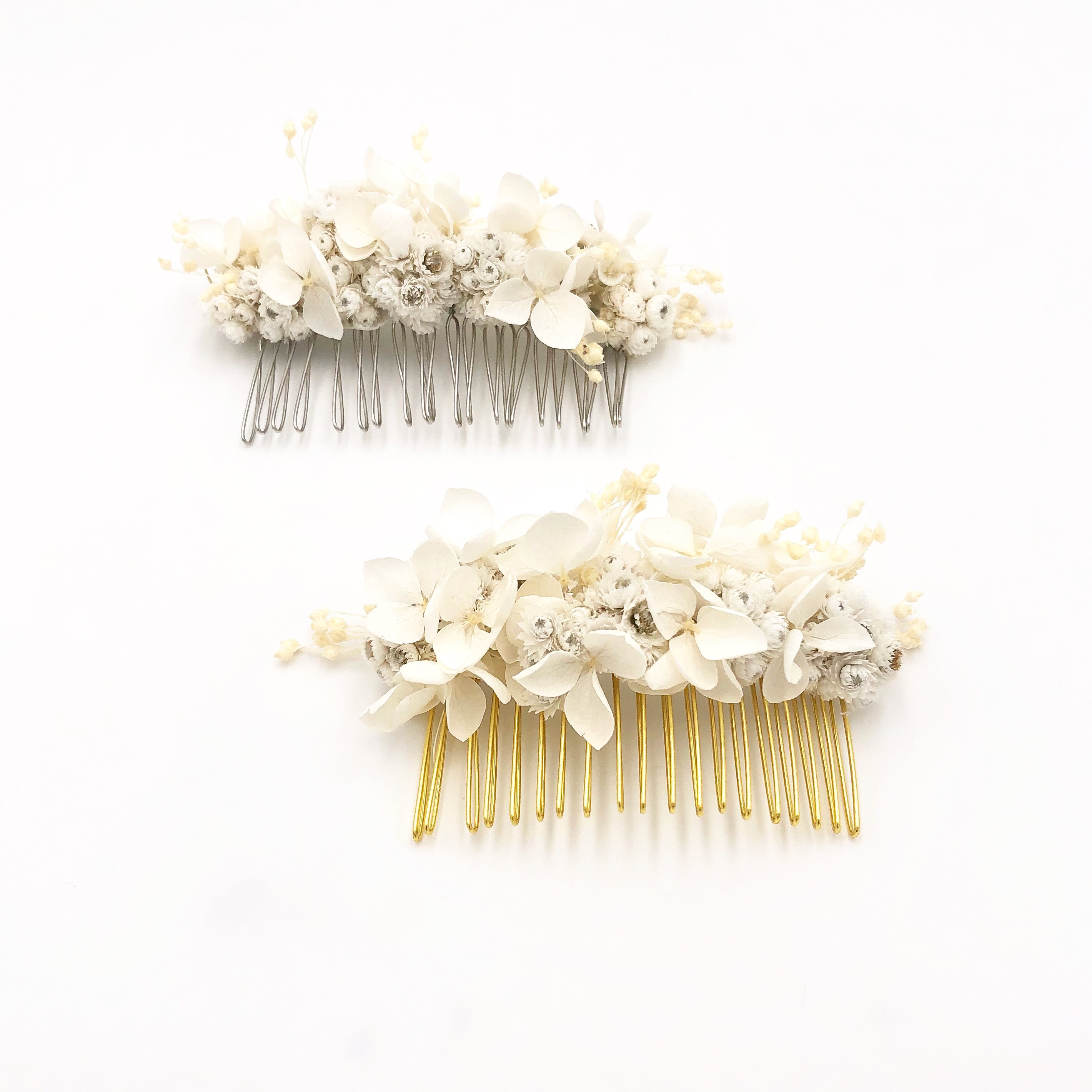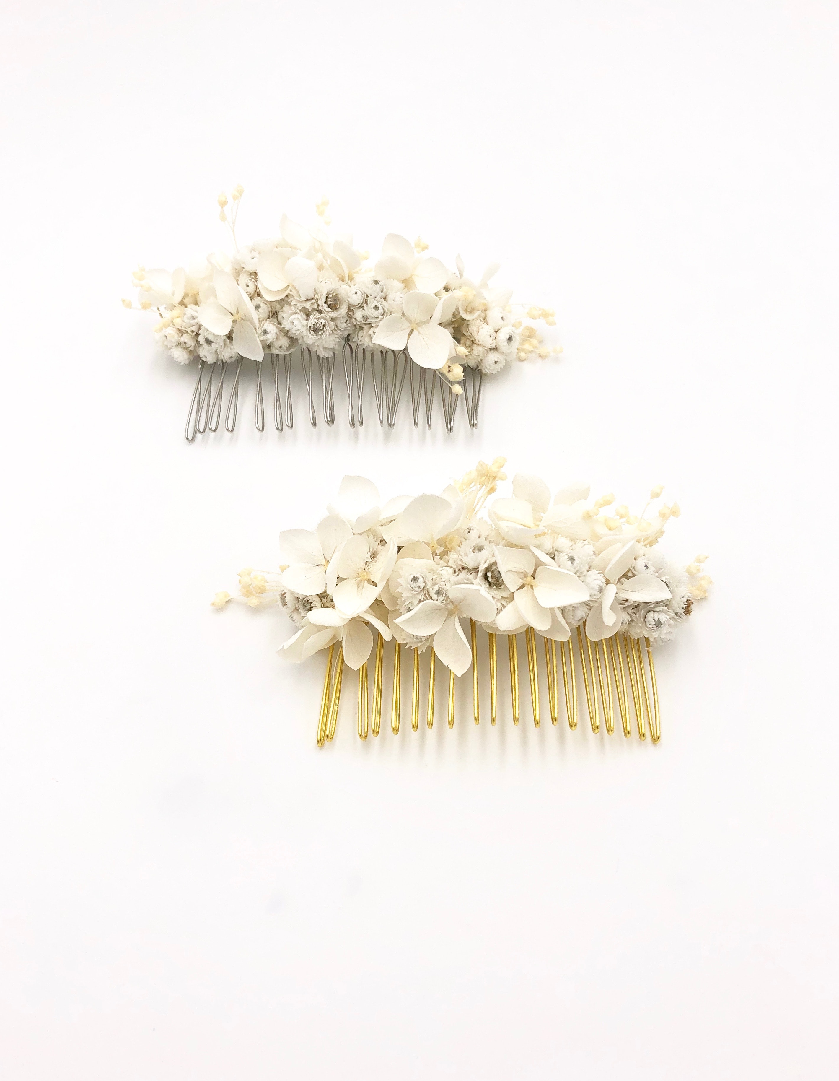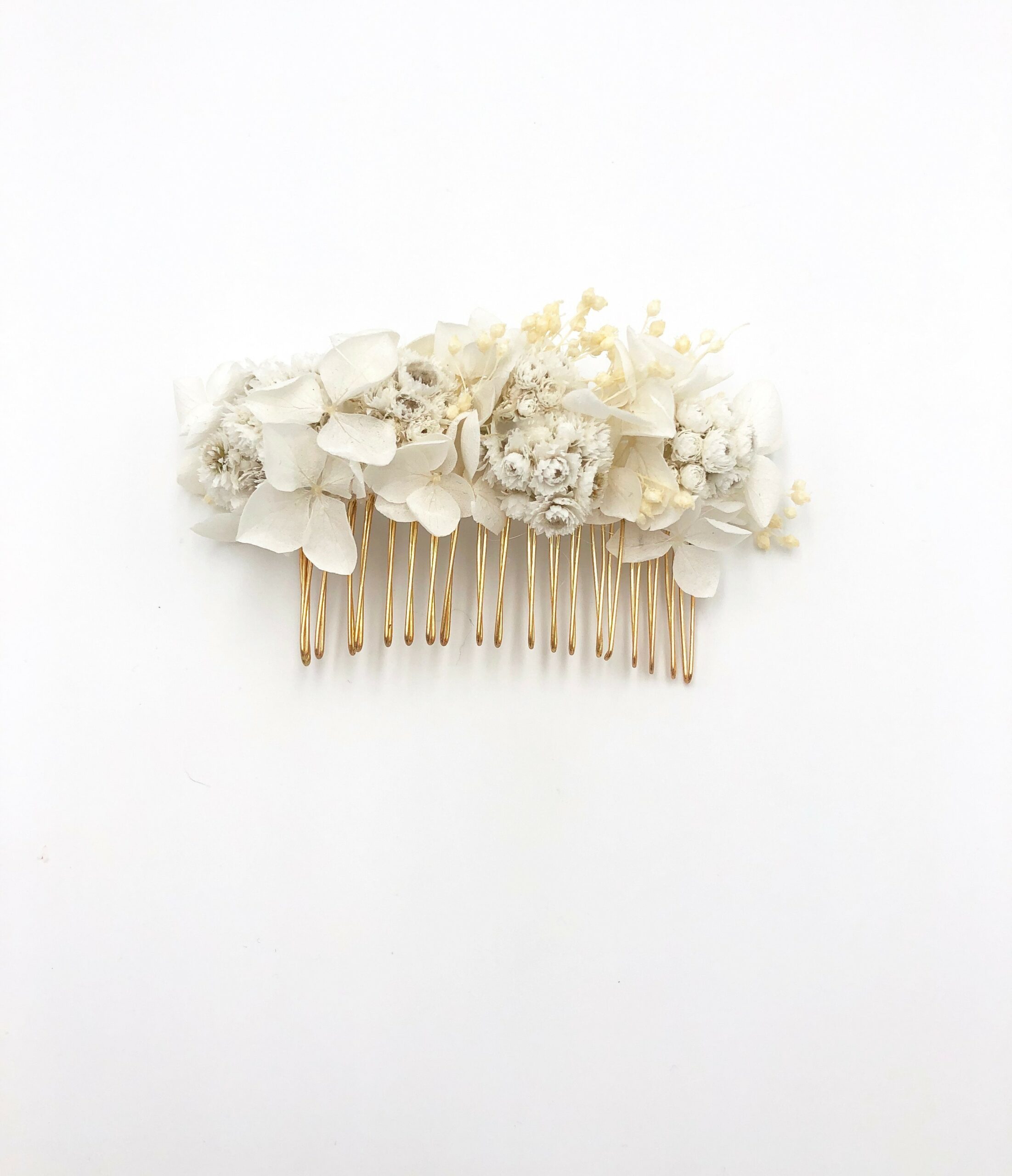 Le peigne de mariage Immortelle évoque la douceur et la force d’un amour pur avec ses généreuses fleurs d’Immortelles blanches. C’est un accessoire très délicat et raffiné qui mêle la rondeur des fleurs d’Immortelles et les douces fleurs d’Hortensia blanches stabilisées. Il se décline dans les tons blancs et ivoire. Immortelle est une véritable ode à l’amour, idéal pour magnifier votre chignon, et ô combien chic lorsqu’il est associé au Bracelet pour les demoiselles d’honneur.