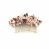 Le peigne de mariage Phyra Antique est une version originale et mode, spécialement imaginée pour la collection Orichalque. Cet accessoire est créé dans un style unique et très contemporain, et il apporte une allure racée en plein dans l’imaginaire antique, donnant instantanément un look moderne à la mariée. Il est composé uniquement de fleurs séchées et de fleurs stabilisées, certaines étant dorées comme les billes de lin, d’autres cuivrées, comme les feuilles d’eucalyptus, et d’autres de couleur rose antique, comme l’hortensia et les achillées, apportant caractère et romantisme.