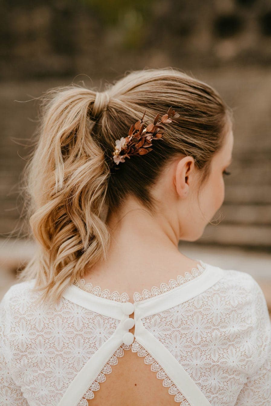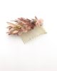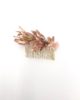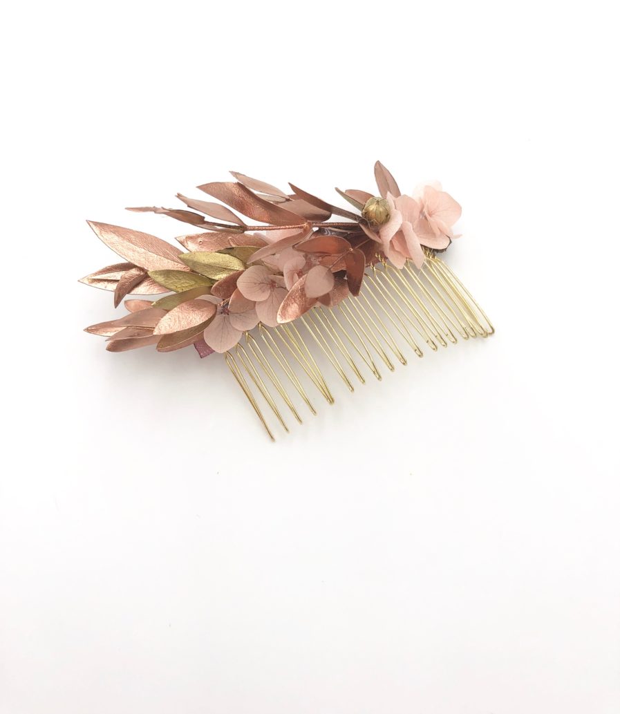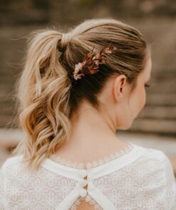 Composé uniquement de fleurs naturelles, à la fois séchées et stabilisées, ce peigne ressemble à s’y méprendre à un bijou de tête. Mais ce sont bien des fleurs d’eucalyptus qui sont cuivrées, et des billes de lin dorées, qui sont associées à des fleurs comme l’achillée. C’est un façon originale de porter un accessoire en fleurs, tout en donnant une image très élégante et précieuse du bijou de métal.