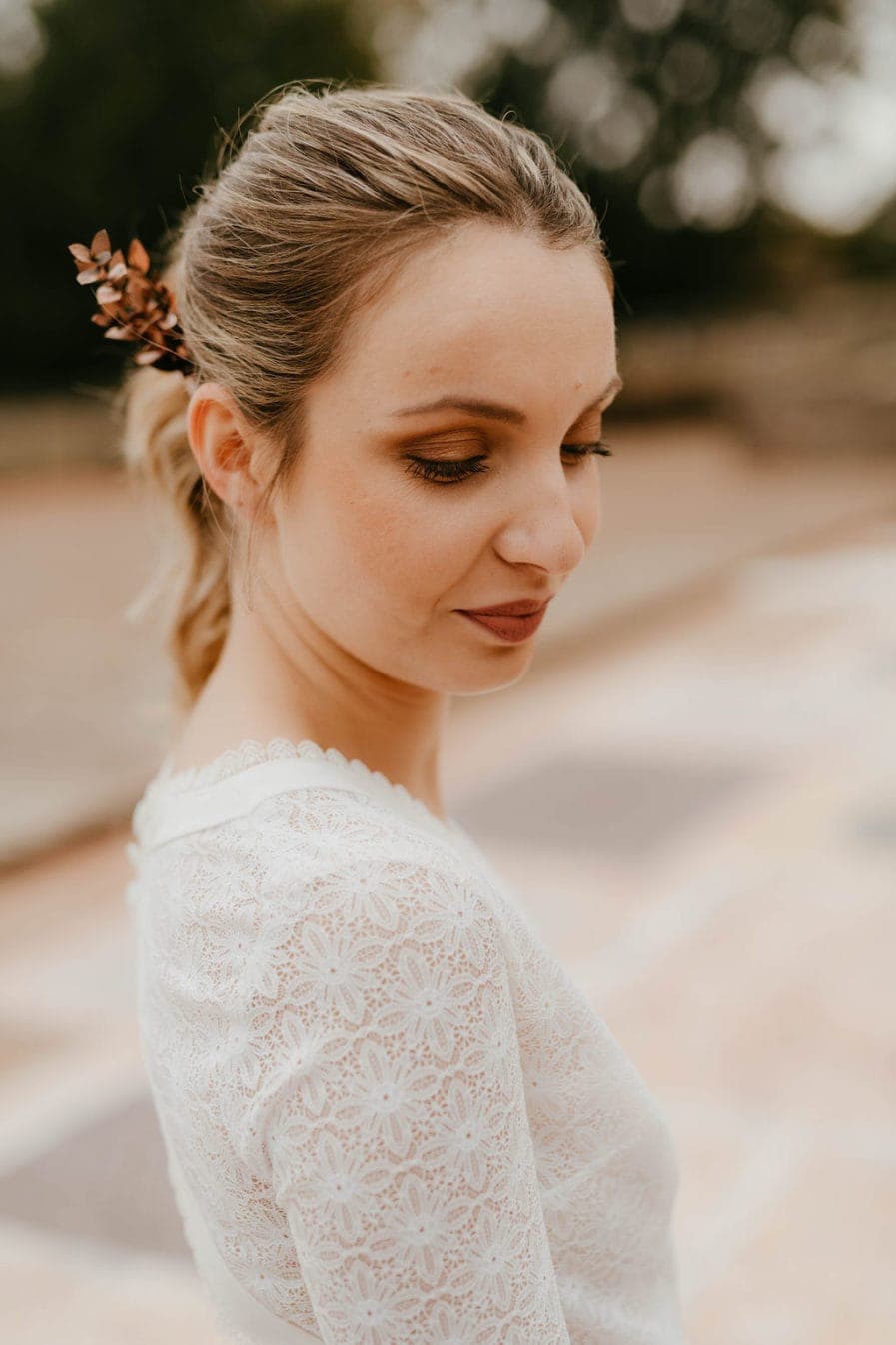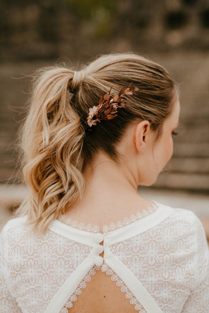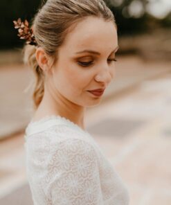 Cet accessoire de fleurs peut être une alternative appréciable au peigne de fleurs Phyra classique, si vous souhaitez un accessoire de tête discret, mais avec une touche d’originalité et un style très mode. Ses courbes effilées aux couleurs cuivre, bronze et doré orneront vos cheveux de la plus belle des manières. Il pourra naturellement se porter sur un chignon, ou sur le côté, mais également afin de sublimer une queue de cheval, l’une des tendances en matière de coiffure ces dernières années. Le peigne de mariage Phyra en version antique se prête merveilleusement bien à un porté sur le bas de chignon, donnant une allure très chic et moderne.