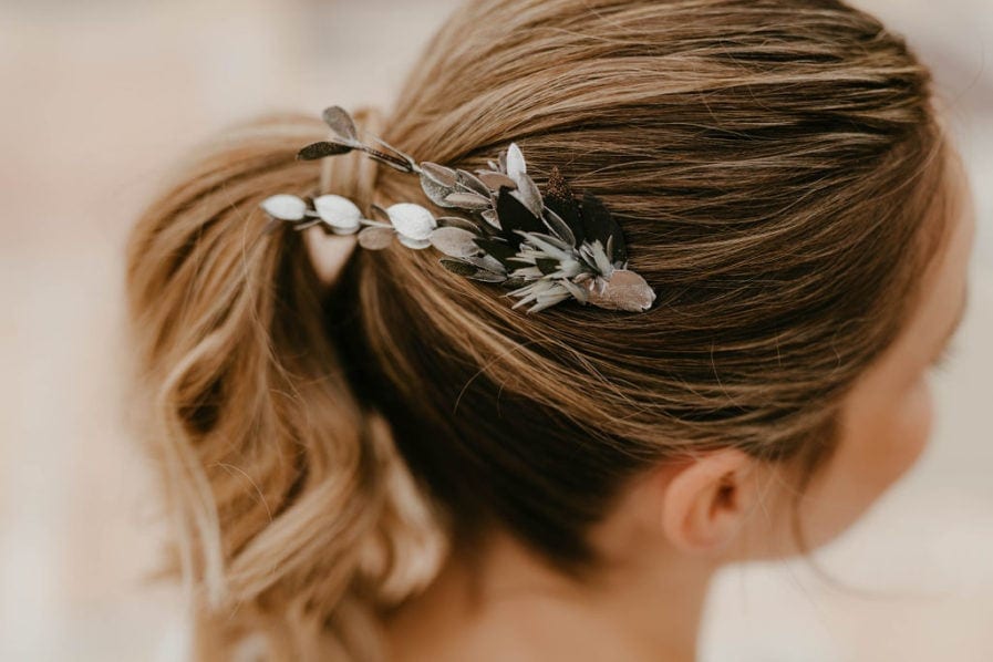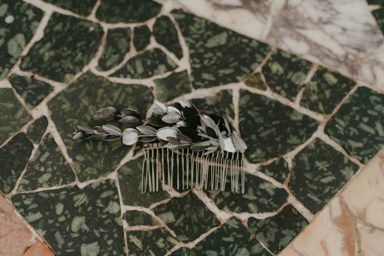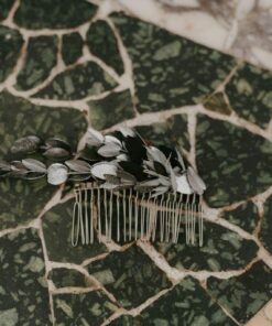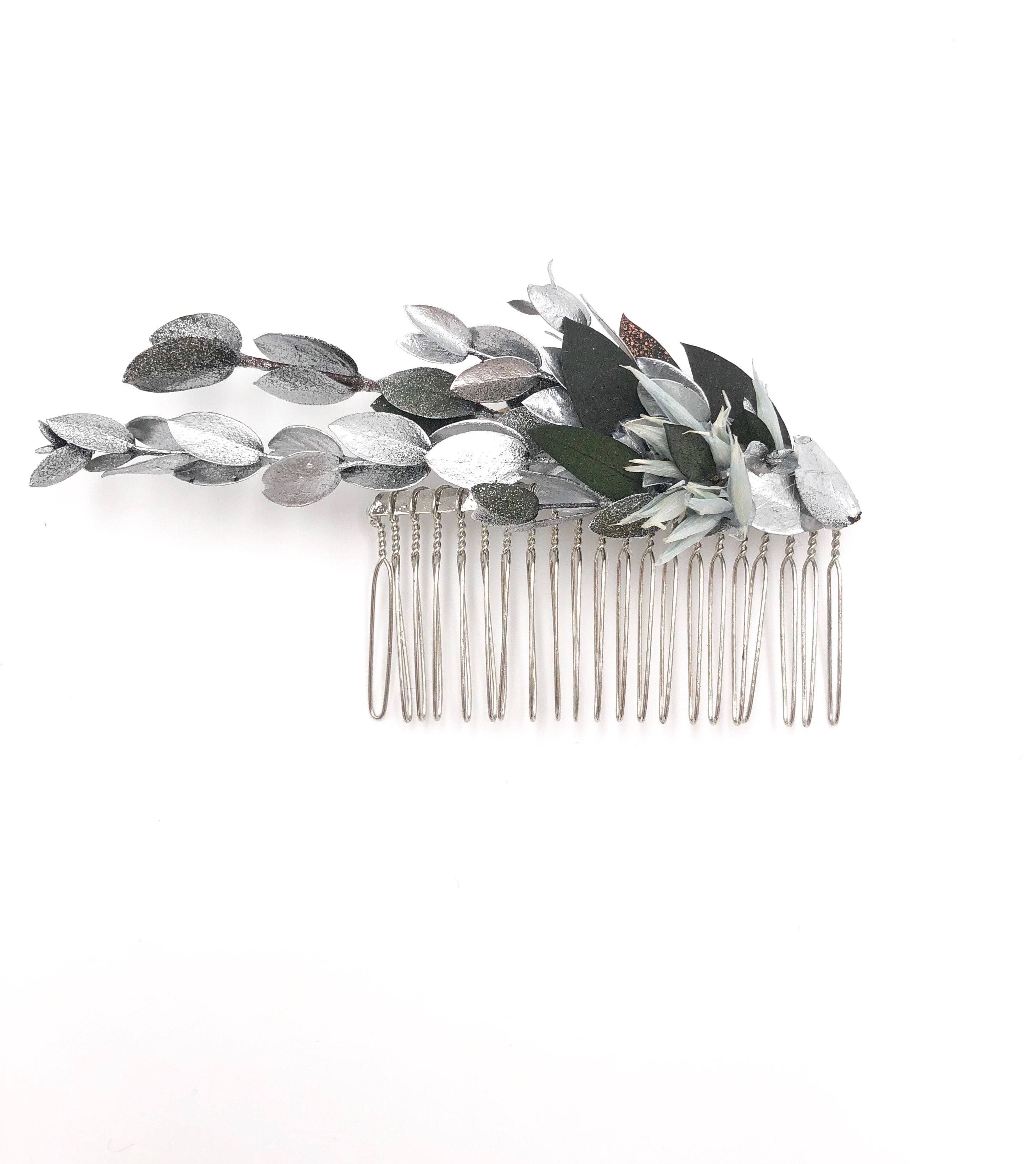 Le peigne de mariage Turquin version Antique est une interprétation très moderne et aux inspirations antiques du peigne Turquin classique. Sa forme effilée et ses courbes de caractère en font un accessoire en fleurs séchées et stabilisées résolument mode, qui sublimera la mariée. Ce peigne de mariage entièrement réalisé à partir de fleurs, surprend au premier abord par l’originalité de son dessin. C’est en effet des feuilles d’eucalyptus stabilisé teintes en argenté qui donnent à cet accessoire un air de bijou d’argent, lumineux et minéral, moderne et antique à la fois.