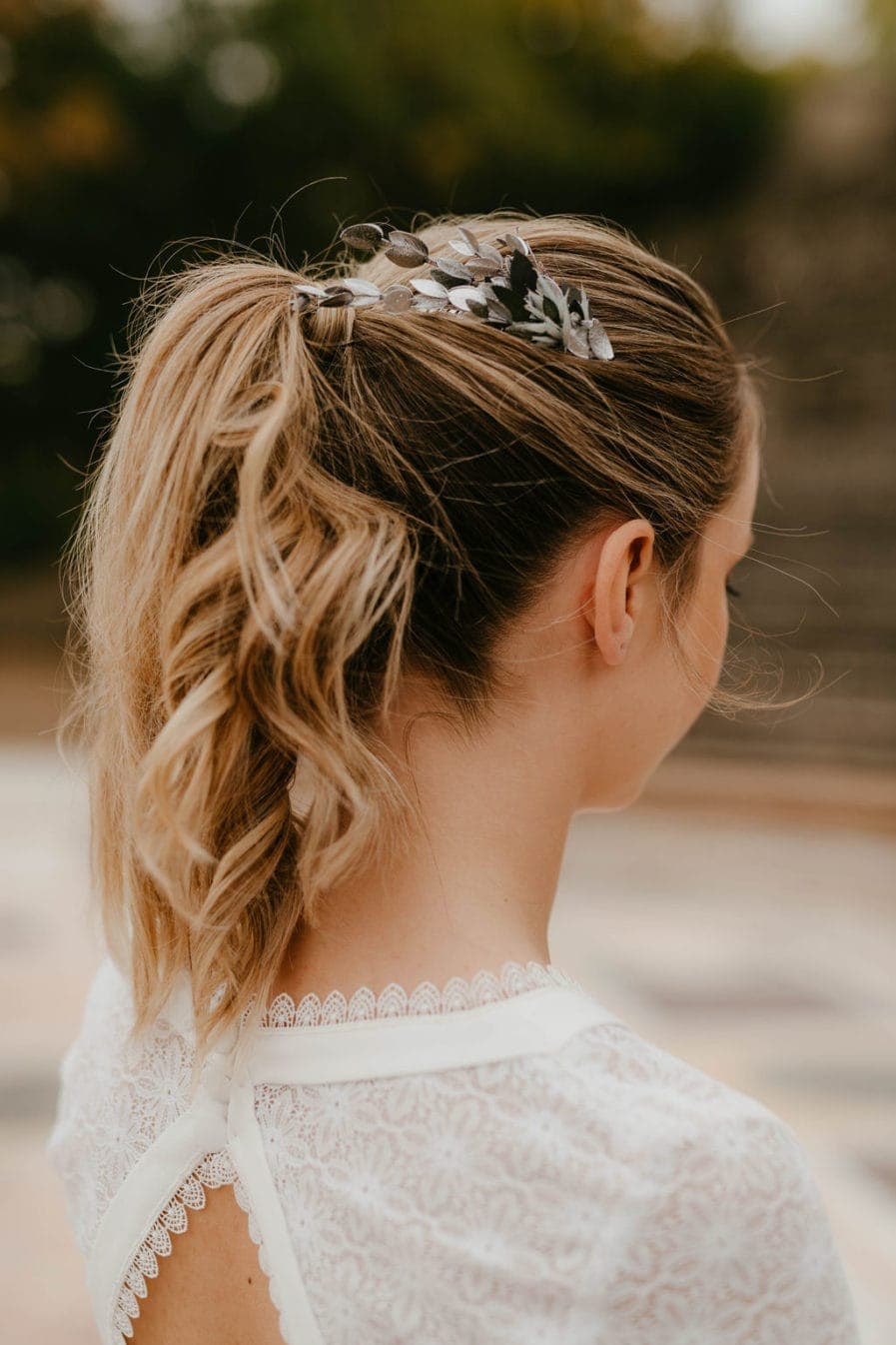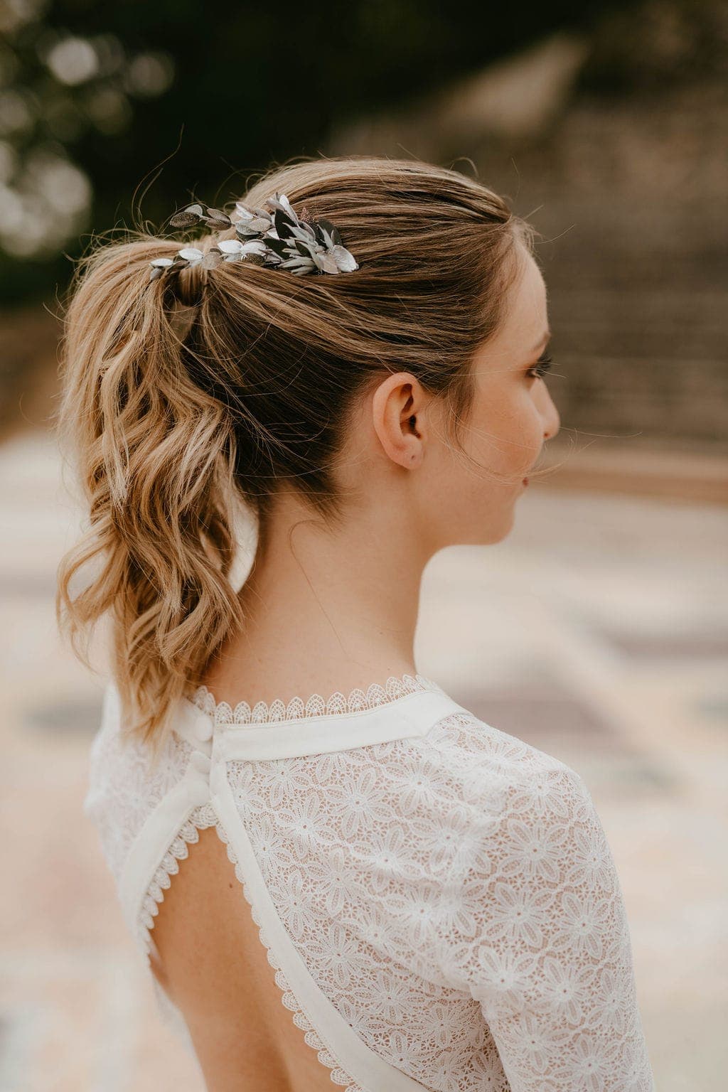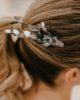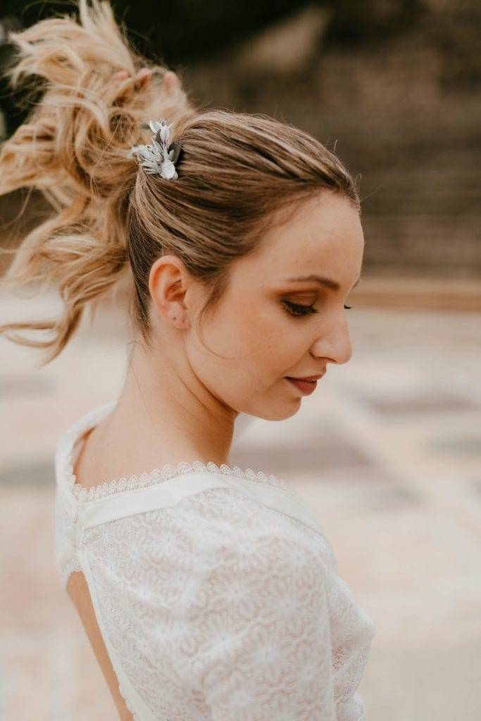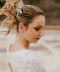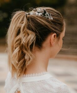 Cet accessoire de tête est une façon aboutie d’ajouter ce petit plus à la tenue de la mariée, sans pour autant prendre le pas sur la robe. En effet, le peigne de mariage Turquin, dans sa version antique, apporte l’originalité nécessaire pour surprendre, mais il rassure par un côté très élégant et classique. Les feuilles effilées et argentées donnent l’impression du bijou, et sublimeront les cheveux clairs comme les cheveux les plus foncés, révélant aussi bien une robe très sophistiquée qu’une tenue plus bohème voire rock. De plus, les tonalités bleutées de ce peigne de fleurs convient à merveille aux thématiques de mariage mêlant chardons et fleurs séchées, ou encore aux costumes des mariés offrant un panel de coloris dérivés du bleu.