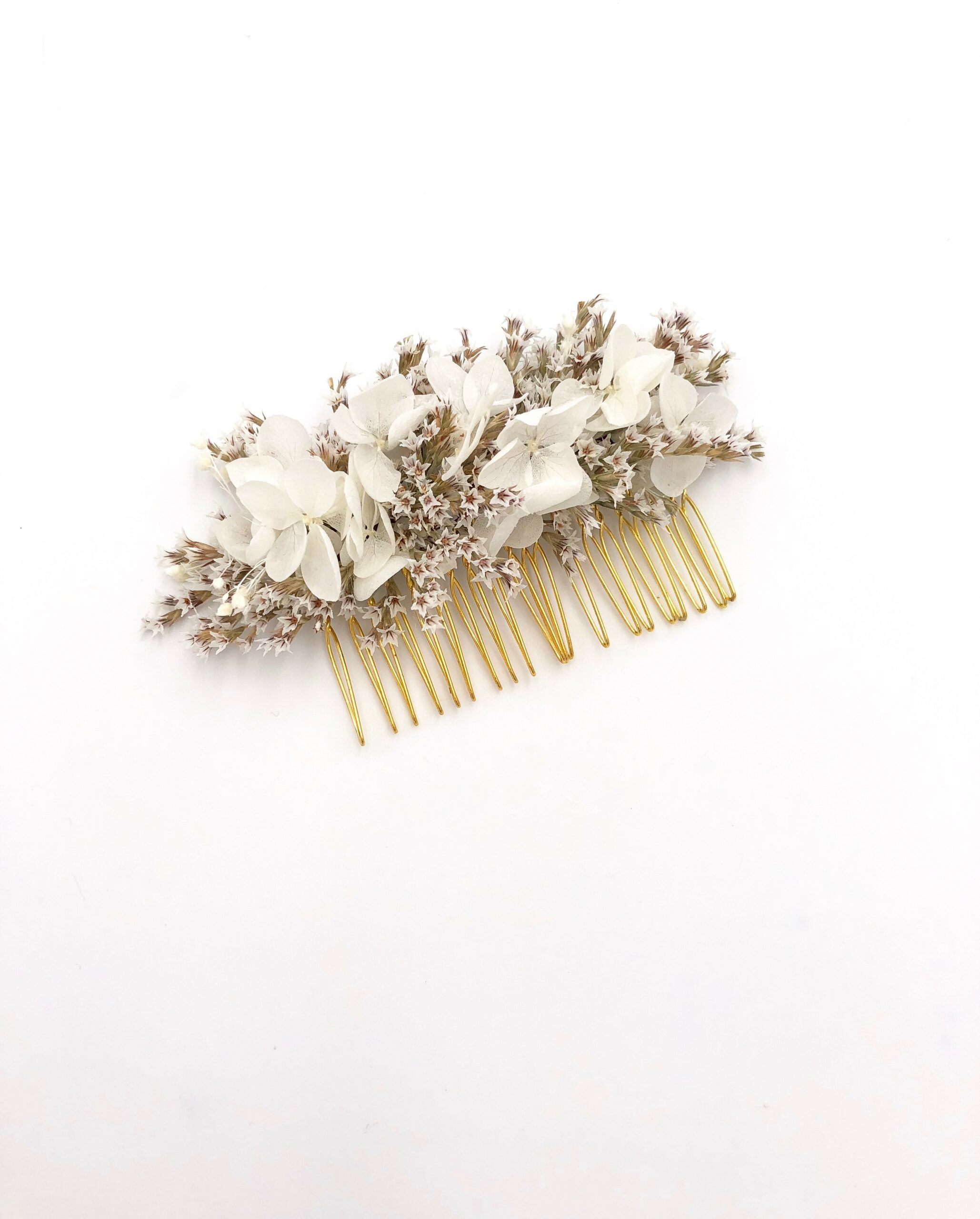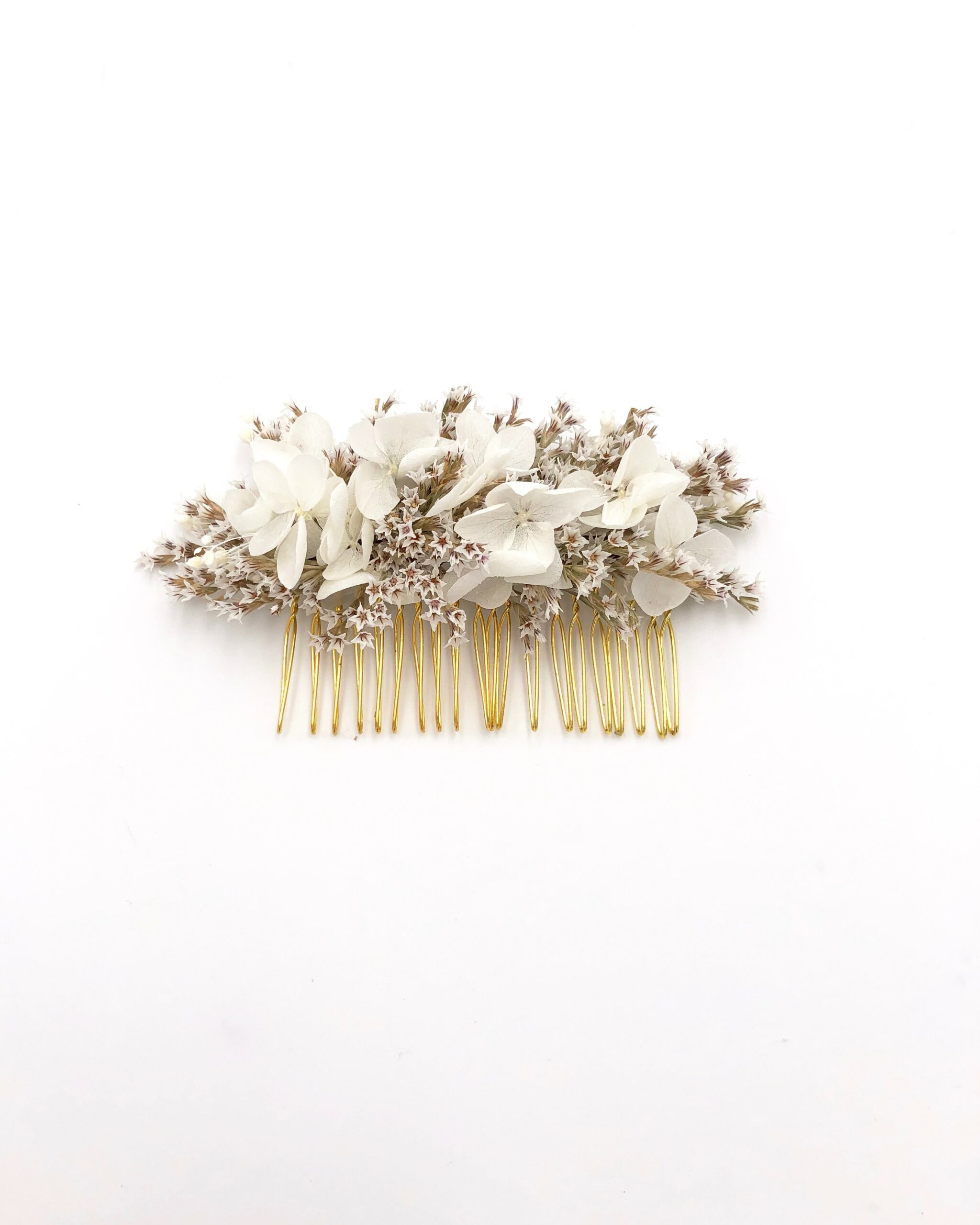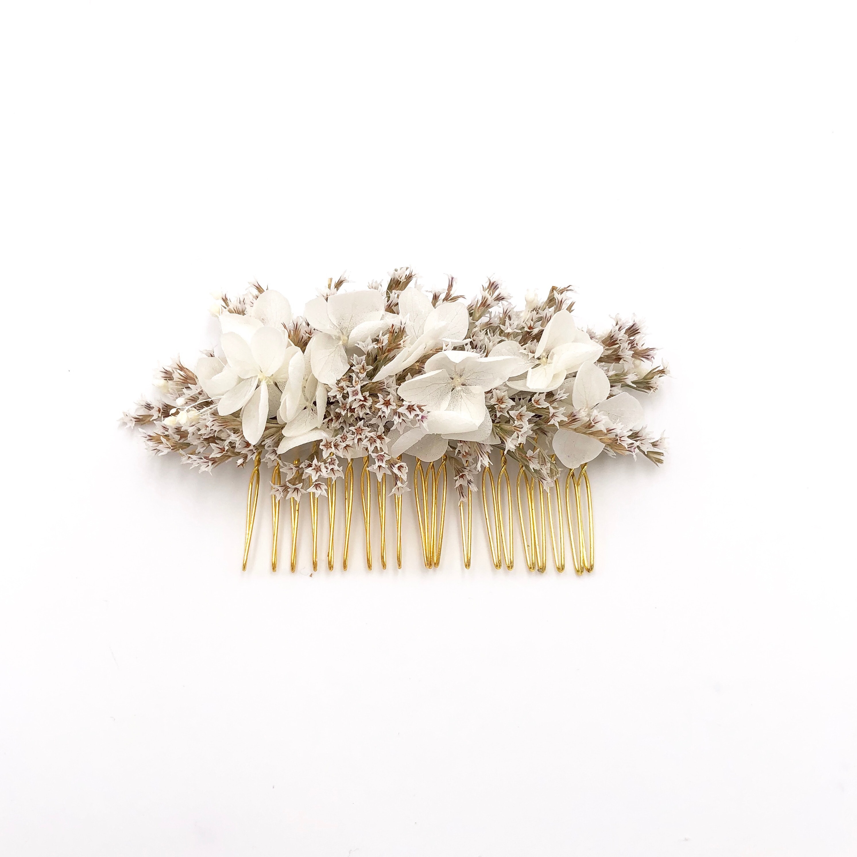 Le peigne de mariée Aster fait partie de la collection Immaculée et de la gamme Aster, qui se distingue par ses tons blancs et son doux côté végétal. Chic et sophistiqué, le peigne Aster est un mélange délicat de fleurs séchées et de fleurs stabilisées, et se conservera durant plusieurs années. La gamme Aster, de la collection Immaculée, offre une simplicité très chic à votre tenue, apportant un beau blanc mêlé de teintes naturelles et fragiles apportées par le statice étoilé.