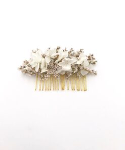 Le peigne de mariage en fleurs Aster existe également sous forme de headband, de couronne ou de barrettes, et s’associera à la perfection avec la boutonnière Aster ainsi que le bracelet pour demoiselle d’honneur Céleste.