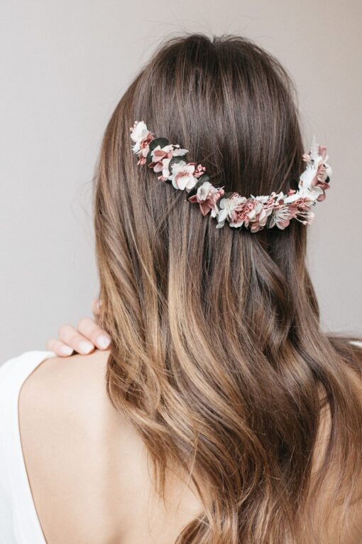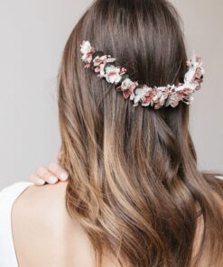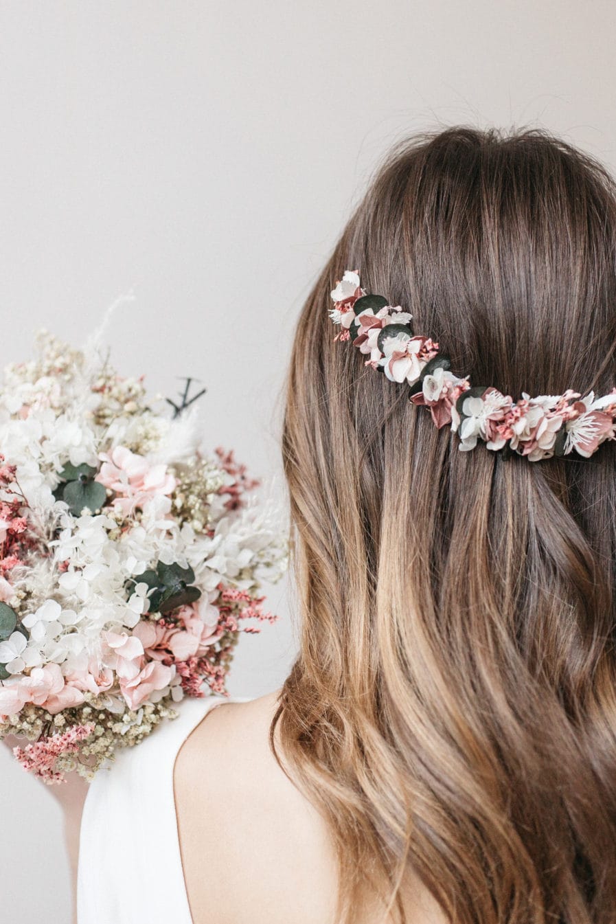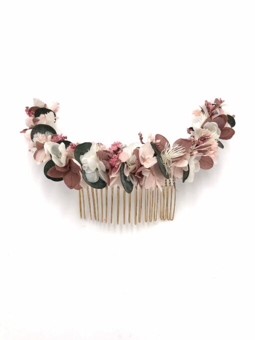 La gamme Tourmaline, et ici le peigne de mariée long, se compose de fleurs naturelles stabilisées : hortensia mini de couleur blanche et rose café, limonium vieux-rose, hortensia rose pâle, fougère blanchie et eucalyptus baby blue. Ce jeu de nuances offre un peigne en fleurs stabilisées résolument moderne, qui garde toutefois une âme tout à fait romantique et délicate. A l’image des reflets verts d’une pierre de tourmaline, ce peigne peut être tantôt vif, tantôt pâle, dévoilant au gré de la lumière les multiples facettes d’un rose subtil et complexe. L’ajout de fines feuilles bien définies de fougère blanchie donne une allure et du caractère à cet accessoire.