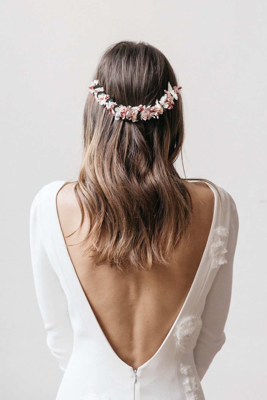 Par cette gamme Tourmaline, en référence à la tourmaline rose et à ses reflets verts, Les Fleurs Dupont développent l’idée d’un accessoire en fleurs intemporel et particulièrement travaillé, à l’image d’un bijou. Le contraste du végétal et des déclinaisons de rose offre un peigne contemporain, romantique et naturel. Avec la collection Quartz, nous souhaitons offrir aux mariées de 2020 des accessoires à la croisée du bijou de tête et de la création en fleurs naturelles.