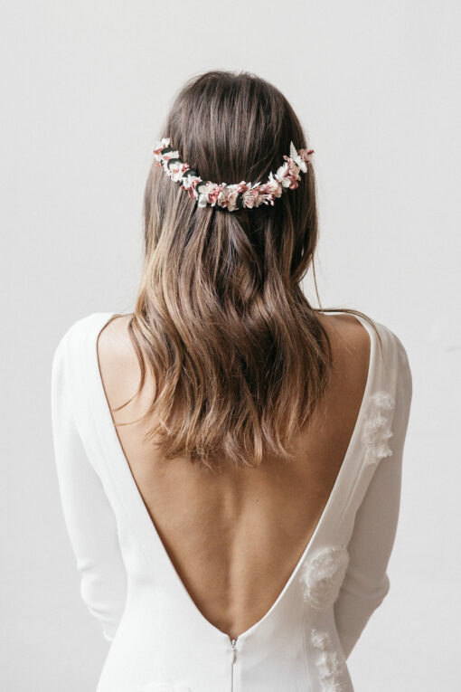 Le peigne de mariée long Tourmaline fait partie de la collection Quartz. Cette gamme décline les accessoires fleuris autour de la couleur vieux-rose, avec des tons doux et puissants. Avec sa thématique de pierres précieuses, cette collection fait des couronnes et autres peignes de véritables bijoux de fleurs, destinés à la mariée moderne et romantique. Ces créations en fleurs stabilisées se démarquent par un travail sur la minutie, la délicatesse et la sophistication des contrastes de couleurs, à la fois saisissants et doux.