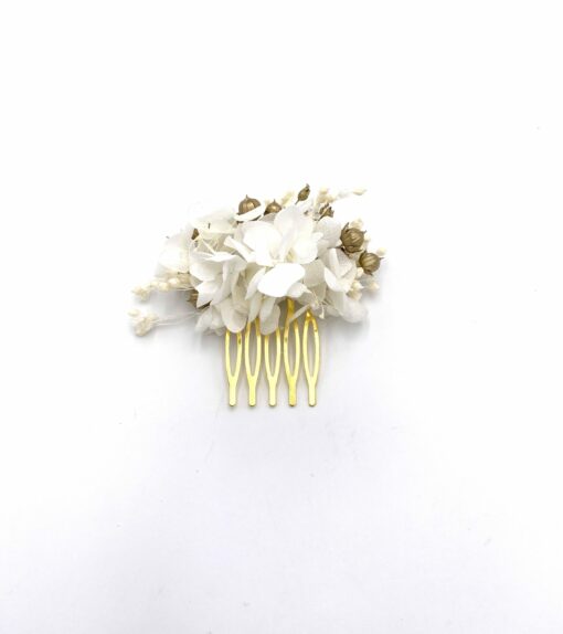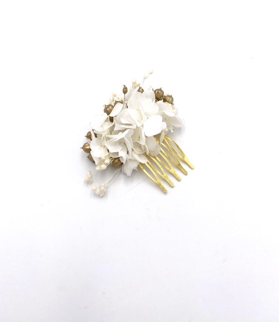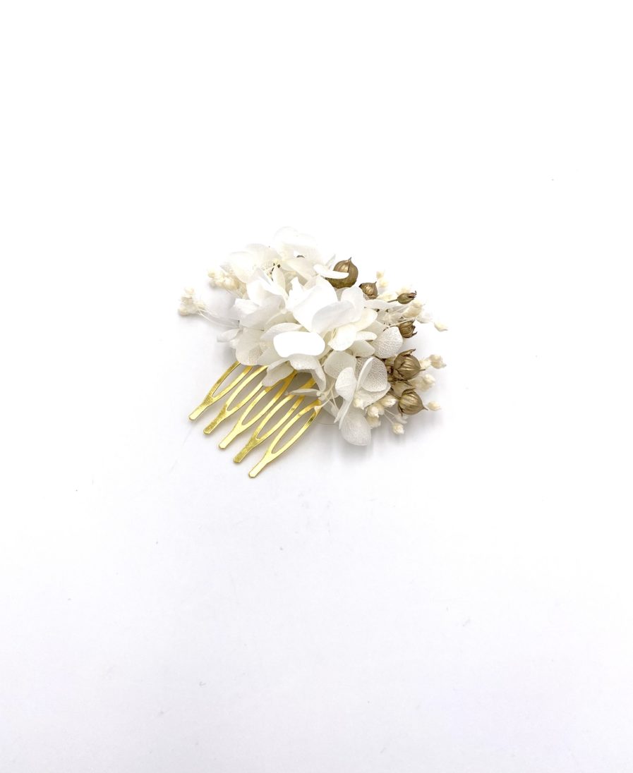 Le peigne en fleurs dorées Aura mini qui fait partie de collection Couture, se distingue par ses tons blancs et ses pointes de doré. Chic et sophistiqué, cet accessoire est un mélange délicat de fleurs séchées et de fleurs stabilisées, avec les hortensias blancs stabilisés et les brins de lin séché dorés par nos soins. La gamme Aura ajoute une touche dorée très chic à votre tenue, et donne ce côté de bijou en or, brillant dans vos cheveux, mais constitué de fleurs naturelles.