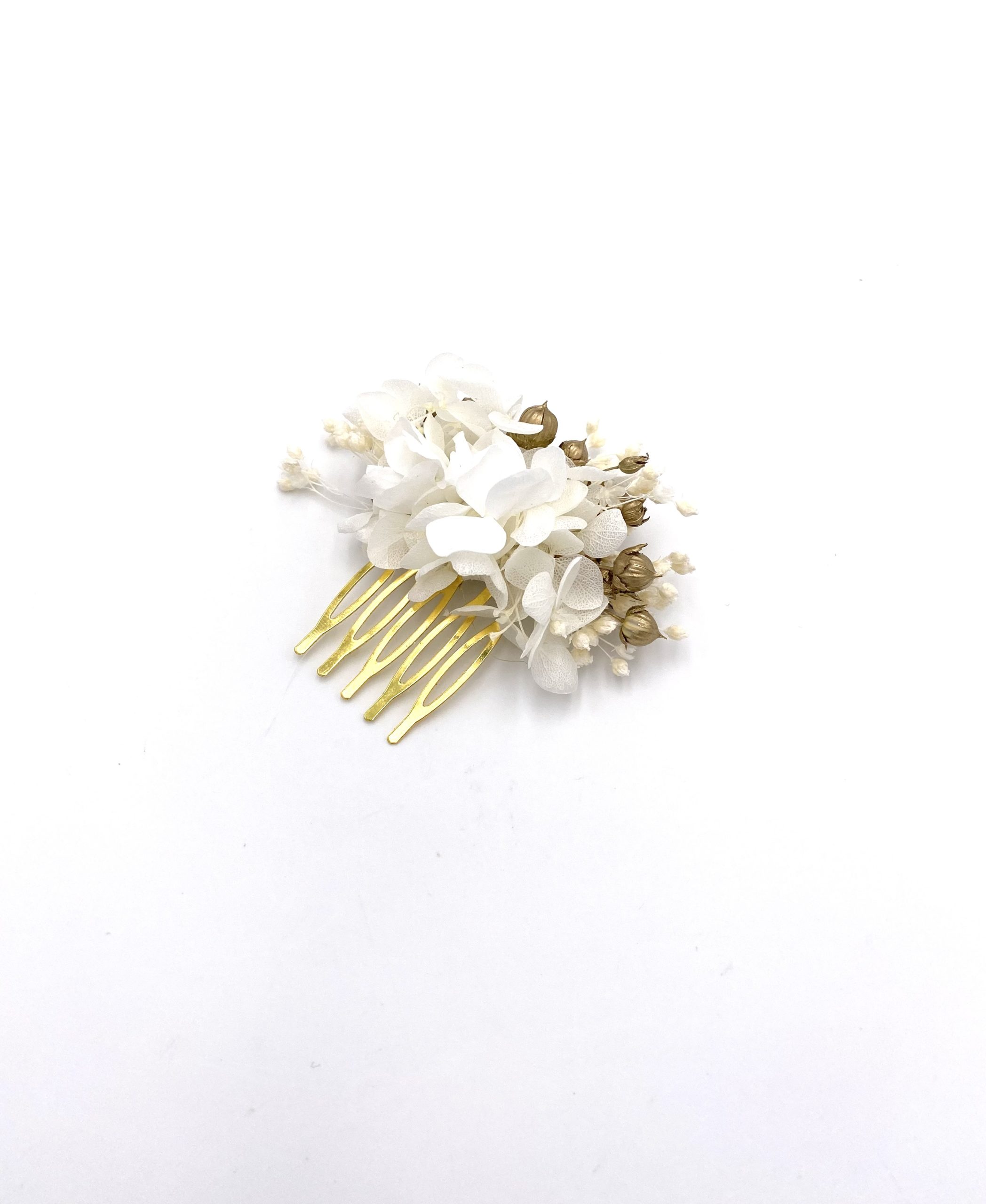 - Peigne en fleurs naturelles séchées et stabilisées (lin séché doré, hortensia stabilisé, broom)