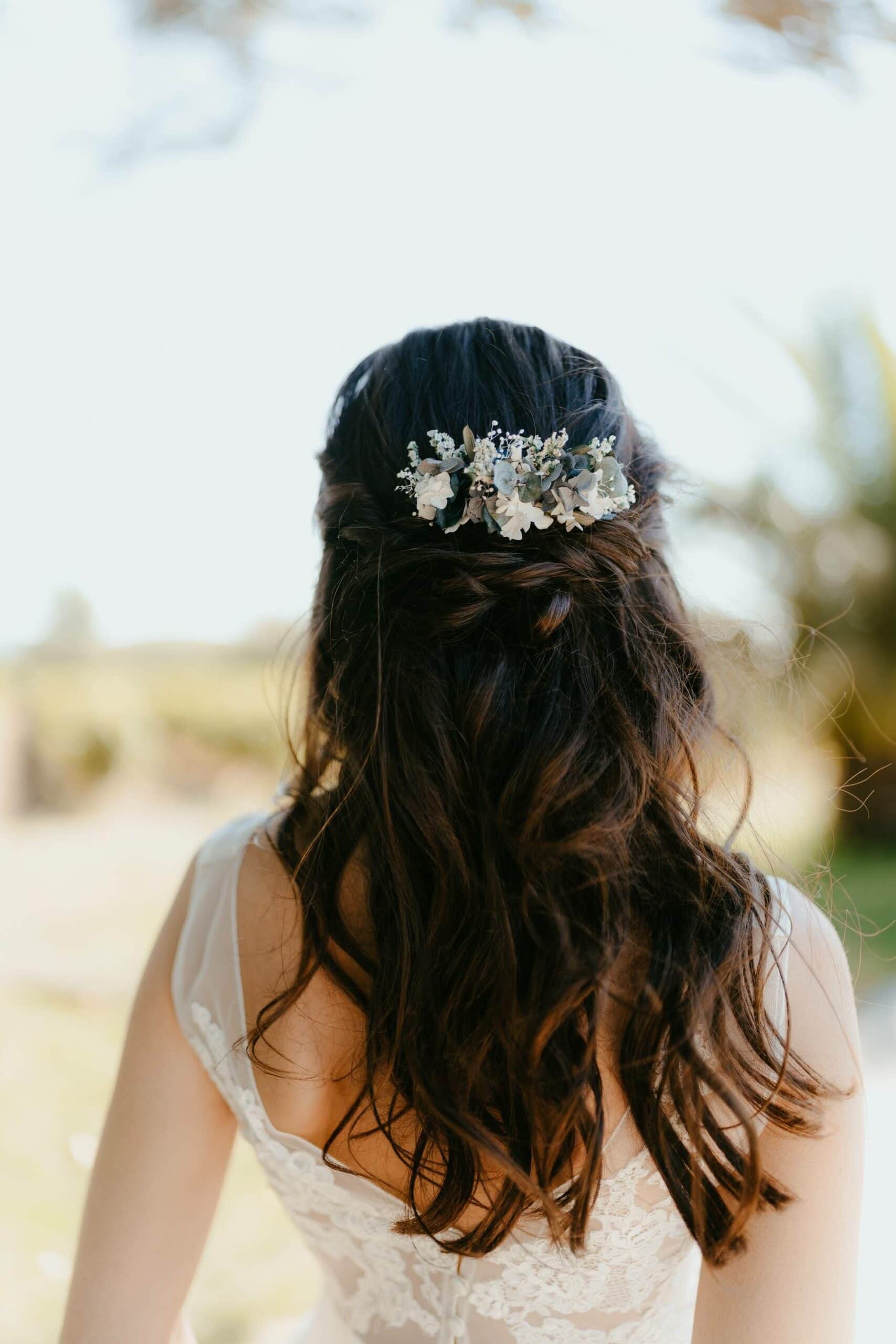 Comme nos autres accessoires pour la mariée, ce peigne se compose de fleurs 100% naturelles durables, stabilisées, qui offrent des avantages en matière de conservation, allant de plusieurs mois à plusieurs années. Pratique pour commander quelques mois avant, et pour le conserver ensuite en souvenir des années.