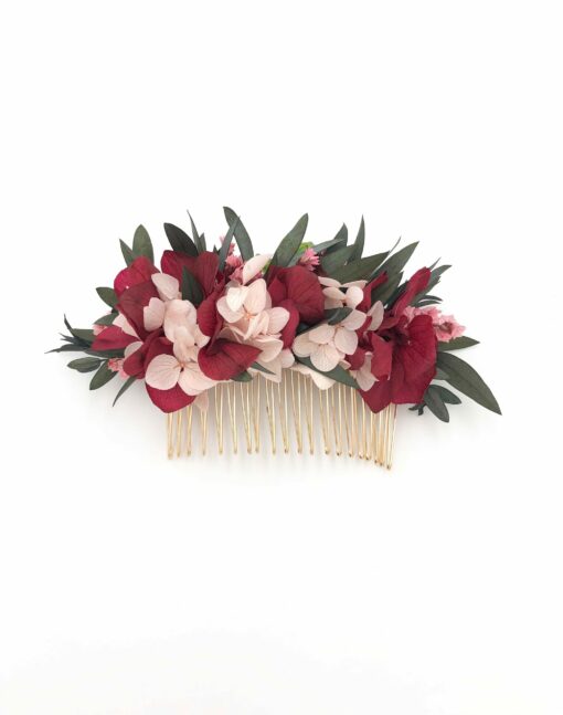 Le peigne en fleurs stabilisées Carmin a été conçu comme un accessoire résolument contemporain, avec un travail précis sur les textures et les couleurs, pour offrir un bijou de fleurs sophistiqué et élégant. La belle robe de ces hortensias bordeaux sera idéale pour sublimer votre décoration et vos tenues de mariage, sur un thème très élégant de déclinaisons de rouge et de bordeaux.