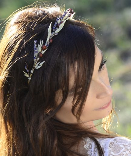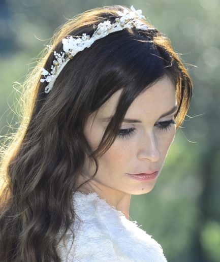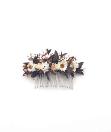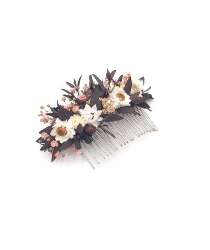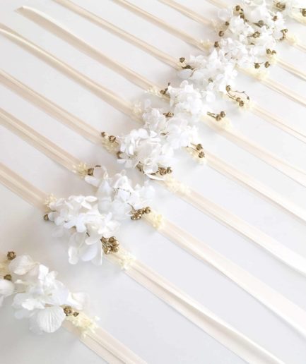 Avec Nimbe, c’est le retour au grand classique, indémodable et chic, c’est l’idée que le mariage n’est pas un événement comme les autres, et qu’il mérite une attention toute particulière, jusqu’à ses moindres détails. Intégralement réalisée en fleurs stabilisées naturelles, la gamme Nimbe et ici le peigne de mariée en version mini, comporte des asparagus blancs, des hortensias stabilisés blancs mini et des petites billes de craspedia blanc crème mini.