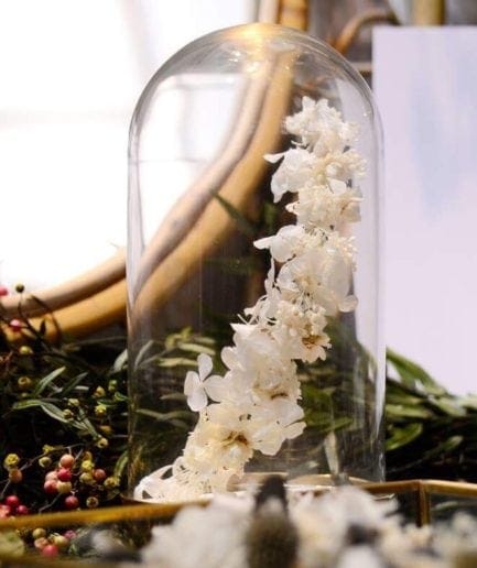 - Fleurs stabilisées naturelles (hortensia mini blanc, craspedia mini blanc-crème, asparagus blanc)