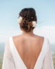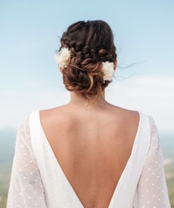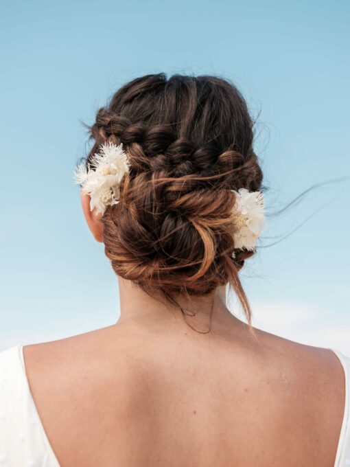 Le peigne fleuri Nimbe en version mini duo comprend deux peignes Mini Nimbe, avec l’objectif de vous proposer de multiples optionsp our votre coiffure de mariage. Il est ainsi possible de poser les peignes de chaque côté d’un chignon, ou encore d’en porter un à l’avant et l’autre à l’arrière de votre coiffure. Vous pourrez ainsi laisser libre cours à votre imagination et concevoir votre propre coiffure de mariage fleurie.