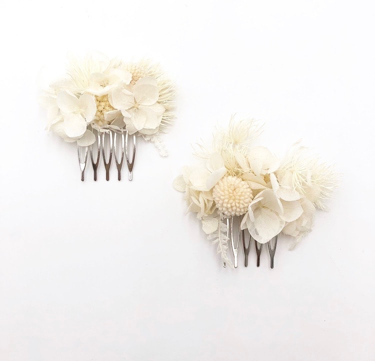 Comme de petits bijoux de cheveux pour le mariage, ces deux peignes mini pourront ainsi se placer en toute facilité où vous le voulez, apportant cette touche fleurie blanche et ivoire dans votre coiffure, comme de petits nuages d’été.