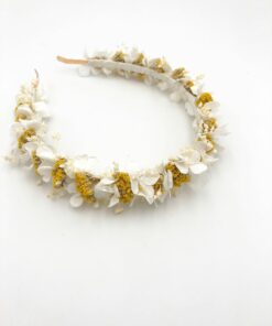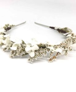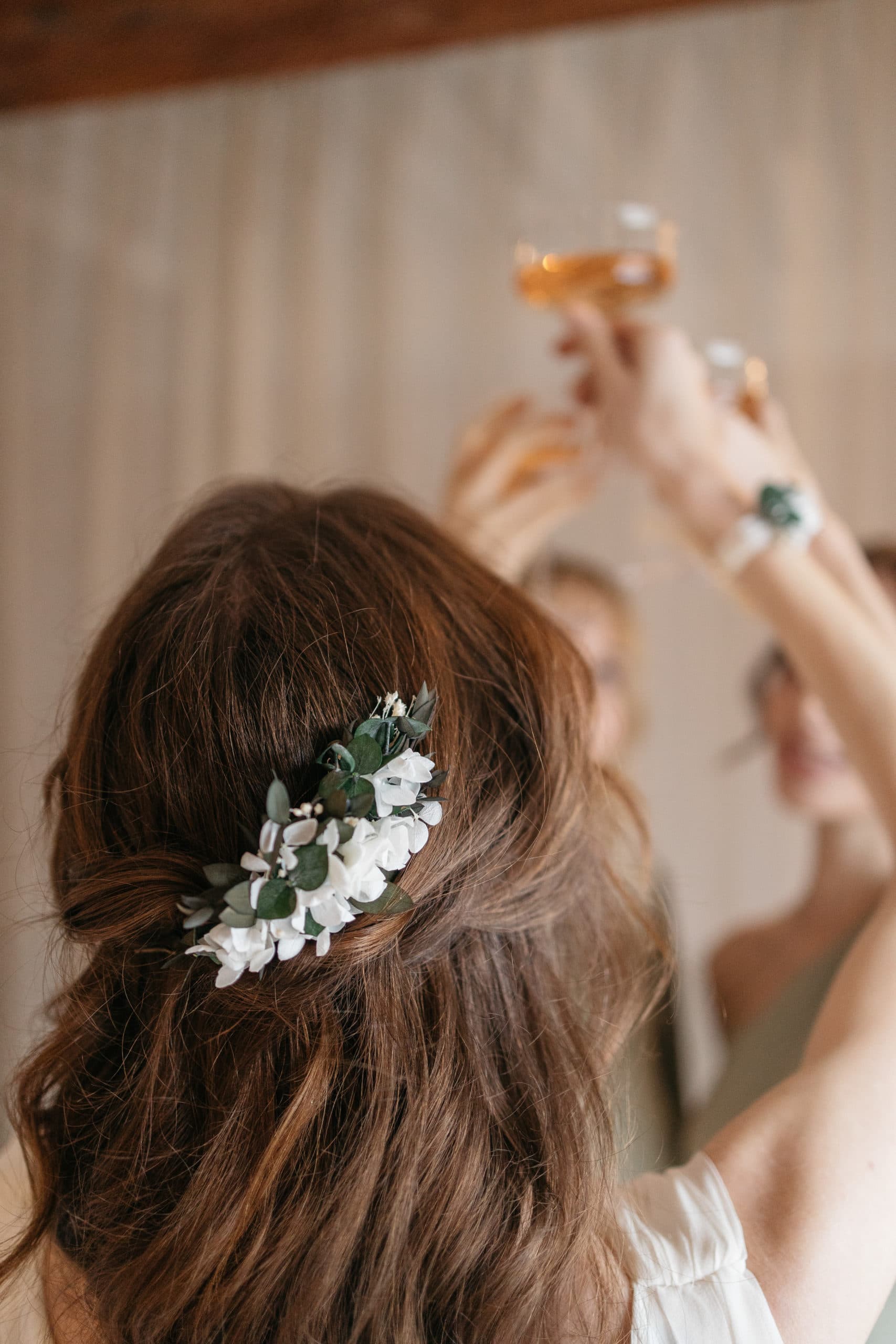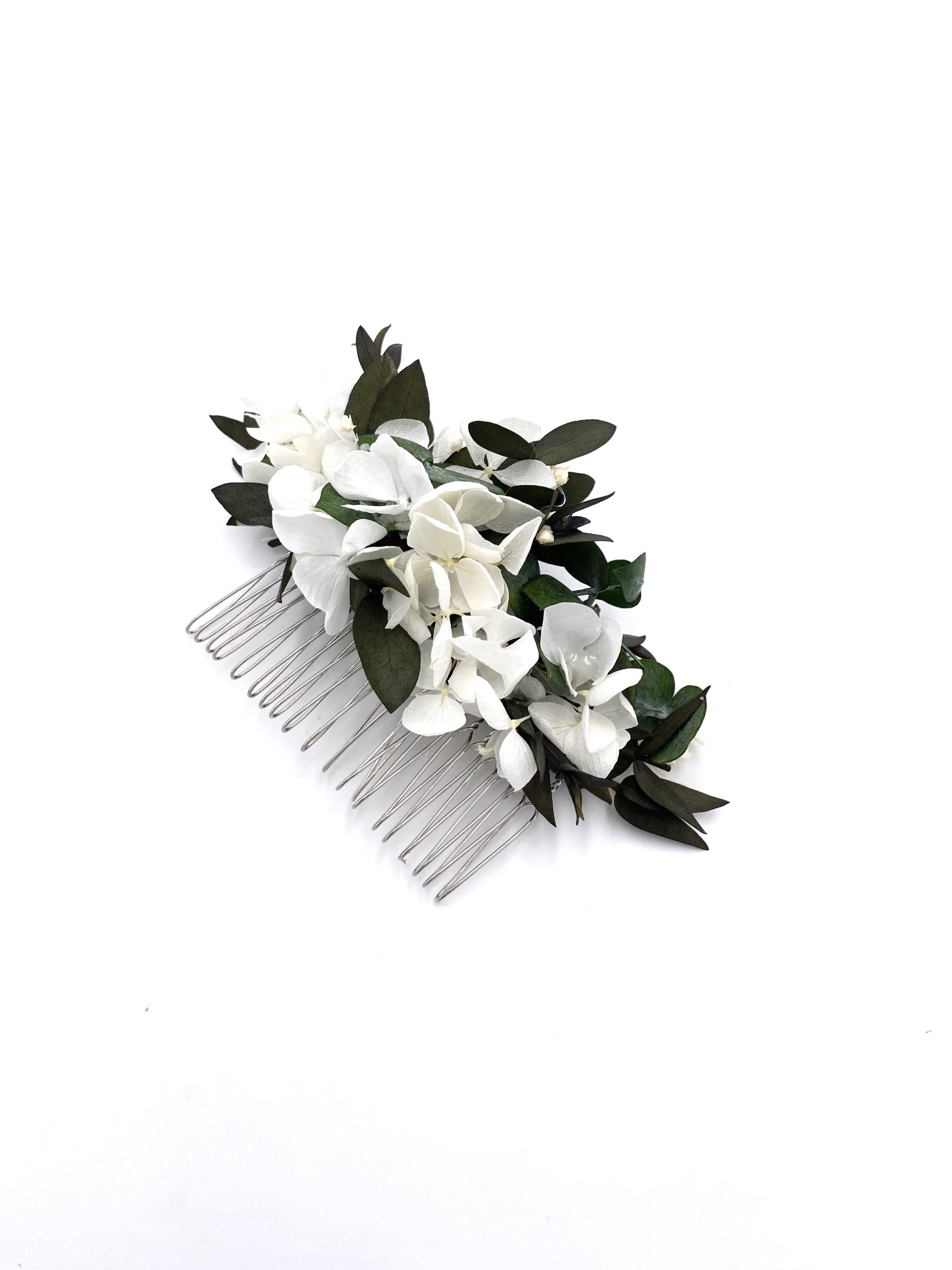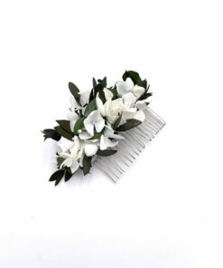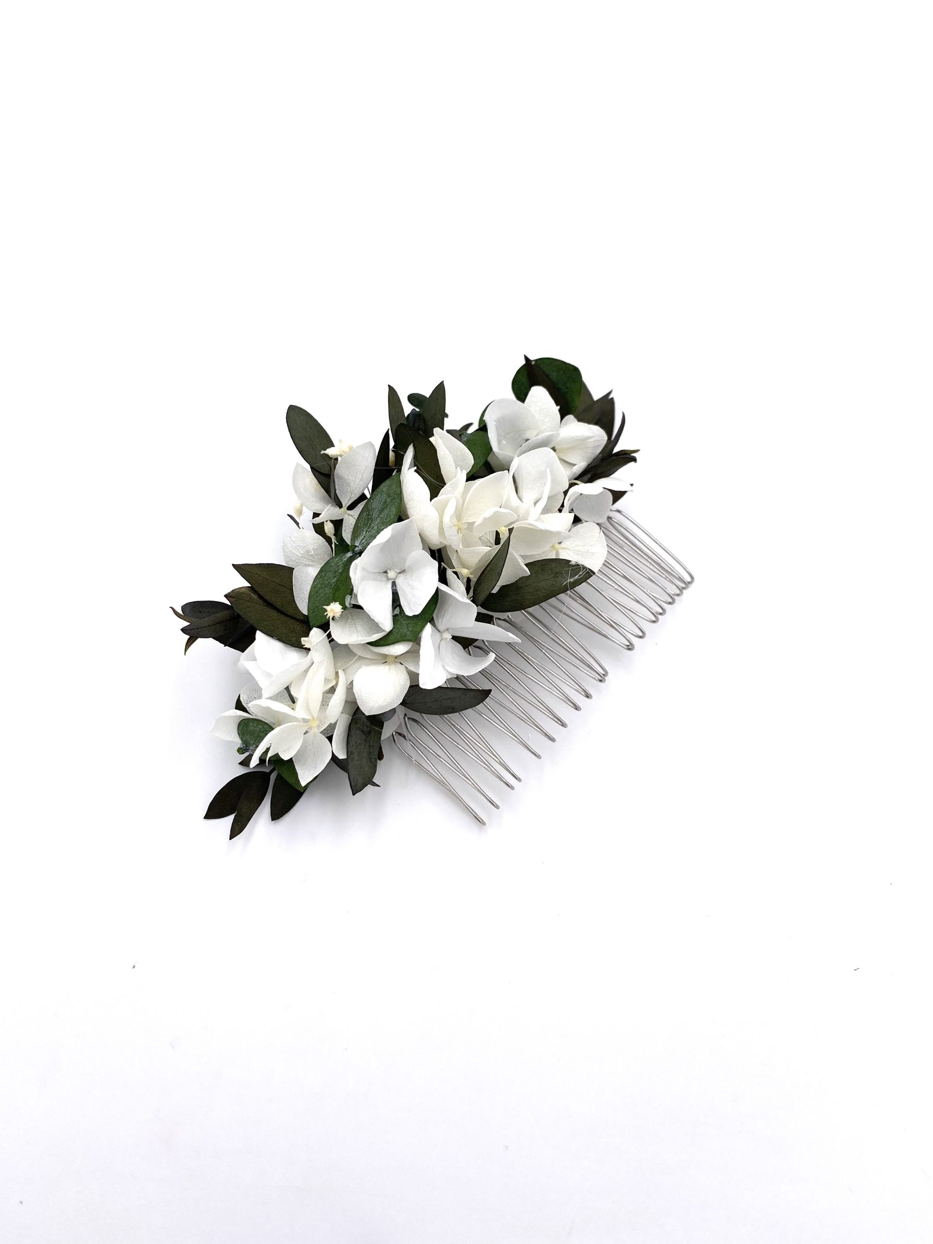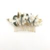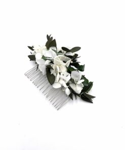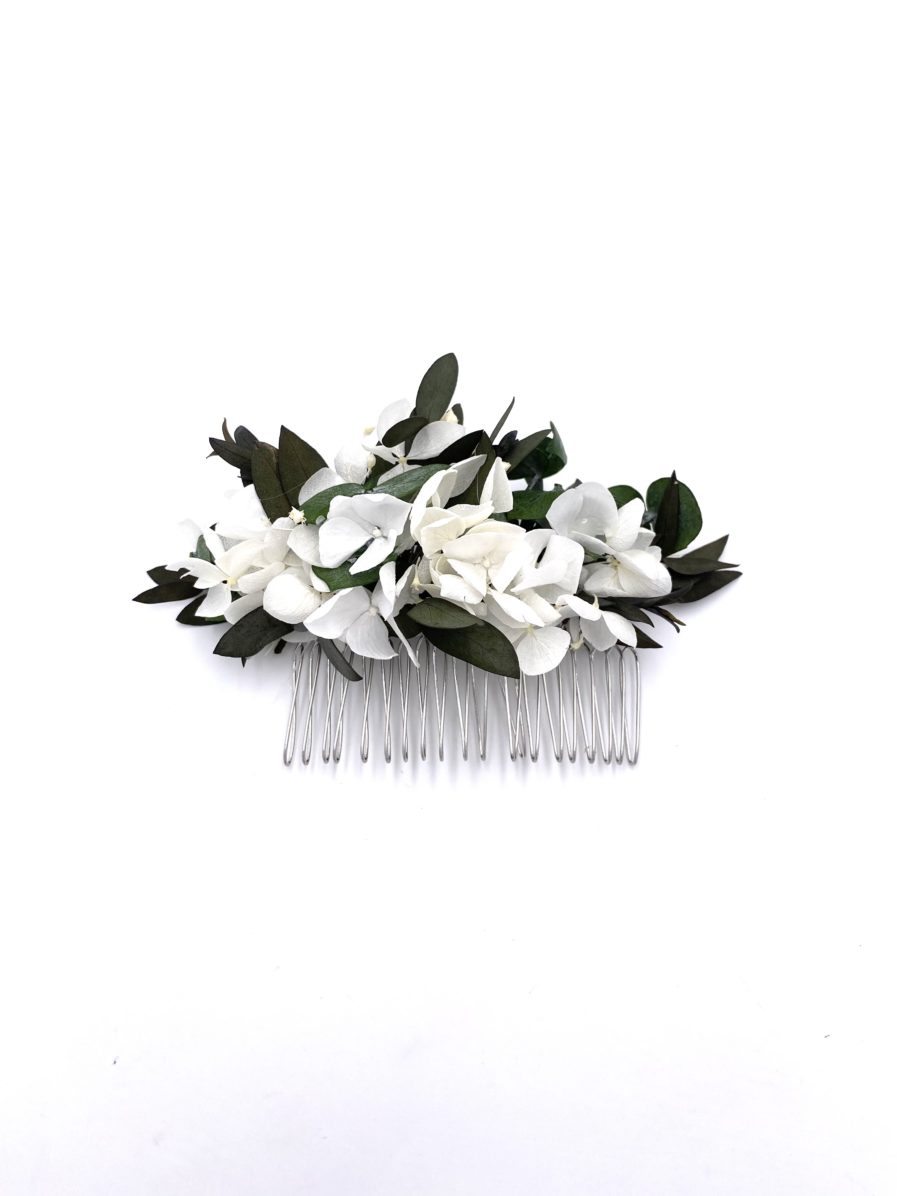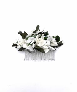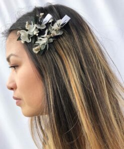 Le peigne de fleurs stabilisées Foglia, comme tous nos accessoires de la mariée, est confectionné minutieusement à la main en France, à Lyon, à partir de fleurs stabilisées et séchées, ces dernières provenant de producteurs français passionnés et spécialisés.