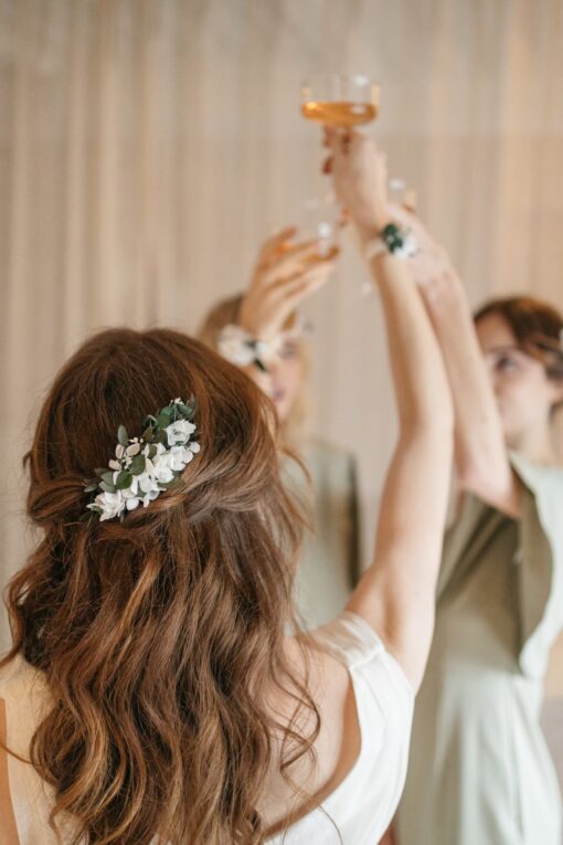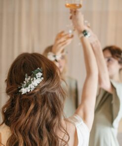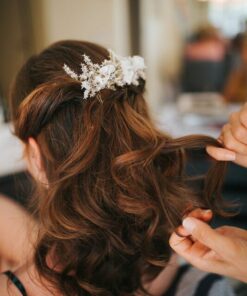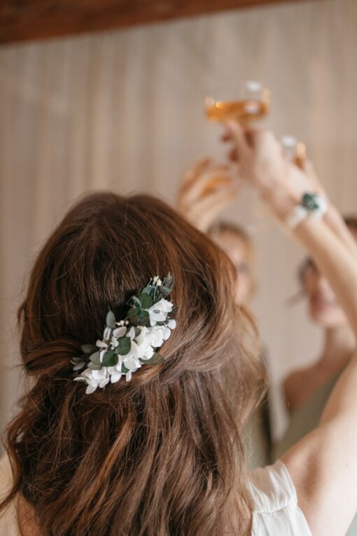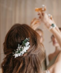 Le peigne de fleurs stabilisées Foglia peut se combiner avec différents accessoires de cheveux pour les demoiselles d’honneur, comme les bracelets simples et élégants. Il est également très chic d’associer la mariée avec le marié ou encore les témoins et membres de la famille, grâce à la boutonnière de la même collection, comme la broche Foglia.
