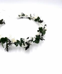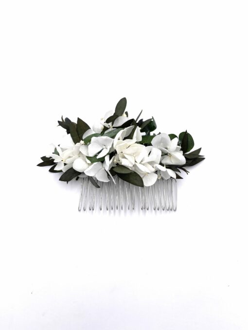 Le peigne de fleurs stabilisées Foglia fait partie de la nouvelle collection Végétale, qui se distingue par ses tons verts et blancs. Chic et champêtre, le peigne Foglia est un mélange délicat de plusieurs fleurs stabilisées, et se conservera durant plusieurs années. Il associe ainsi des feuilles d’eucalyptus Parvifolia stabilisées, des feuilles d’eucalyptus baby blue, et de l’hortensia blanc stabilisé. La gamme Foglia, de la collection Végétale, offre une touche nature et fraîche, chic et raffinée avec ses boutons de rose immaculés, en plein dans la tendance à la fois champêtre et chic de ces dernières saisons.