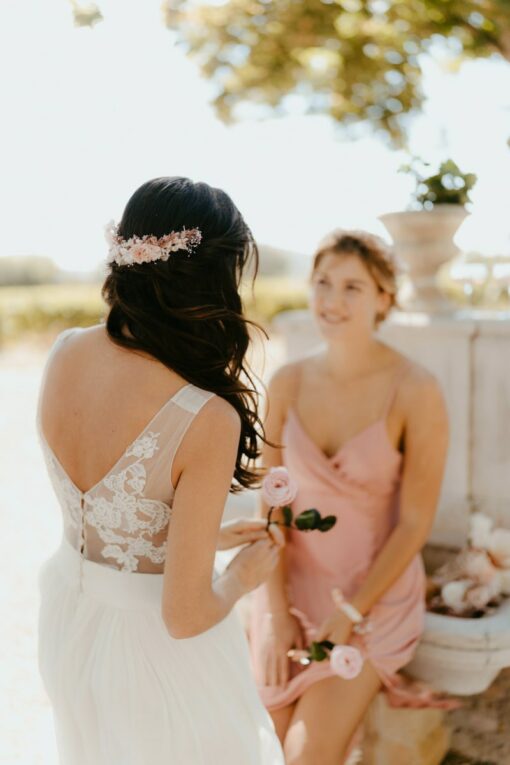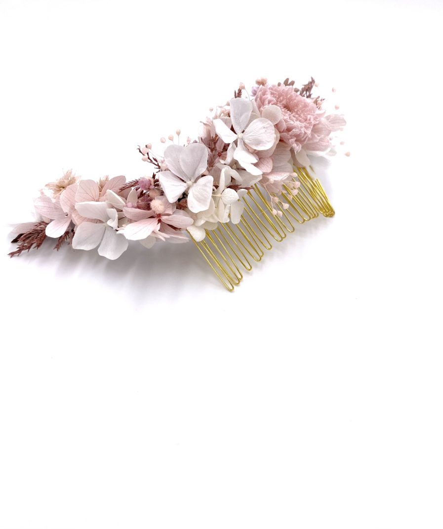 Les Fleurs Dupont déclinent ce type de peigne depuis 2017, participant au bonheur de la mariée et de ses demoiselles d’honneur avec un travail délicat sur ces fleurs naturelles mais durables.