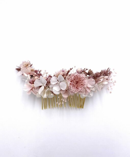 Entre herbes sauvages, hortensias vieux rose, billes de lin, avoines, gypsophiles et autres chrysanthèmes, le peigne long Chérie de la mariée fait la part belle aux fleurs délicates et féminines, aux doux dégradés de couleurs, et à une vision romantique et actuelle du mariage.