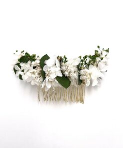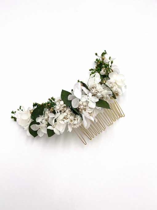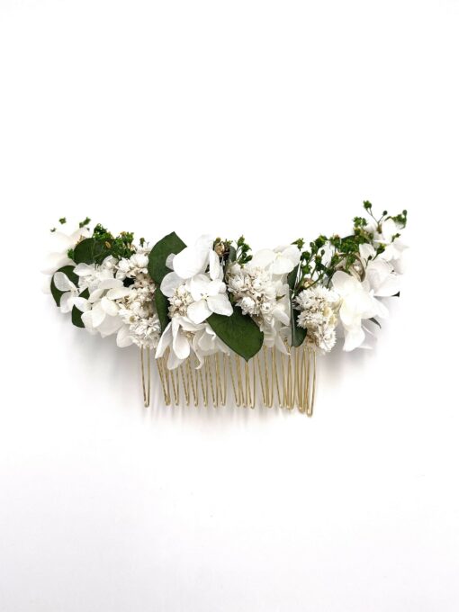 Le peigne Minthé long en fleurs stabilisées fait partie de la gamme Minthé et de la collection Végétale. C’est un accessoire qui se veut très frais et élégant, combinant le vert doux de l’eucalyptus baby blue avec l’ivoire des immortelles séchées, le blanc immaculé de petits pétales d’hortensia stabilisée et l’éclat de quelques billes de lin séché doré. Cet accessoire de mariage est un peigne en fleurs séchées (immortelles, lin doré) et en fleurs stabilisées (eucalyptus, hortensia, gypsophile).