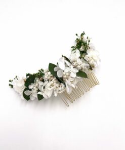 Le peigne Minthé long en fleurs stabilisées se porte facilement et tient seul sur vos cheveux, permettant une multitude de coupes différentes, sublimant notamment un chignon bas, ou encore une queue de cheval, mais aussi sur le côté.