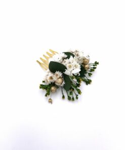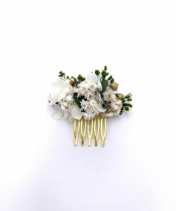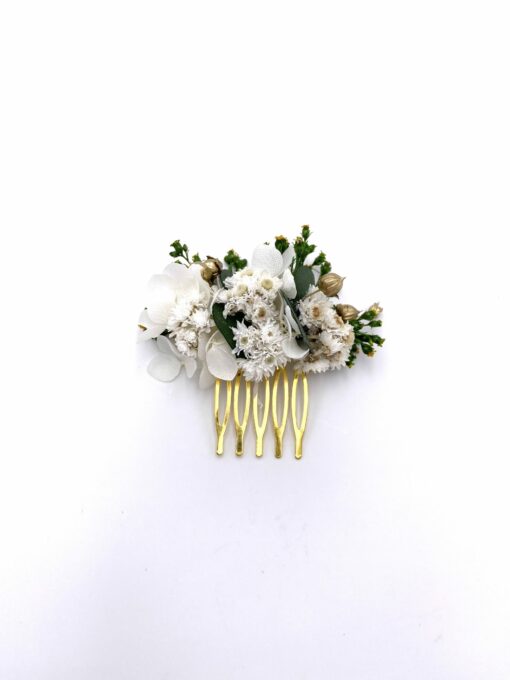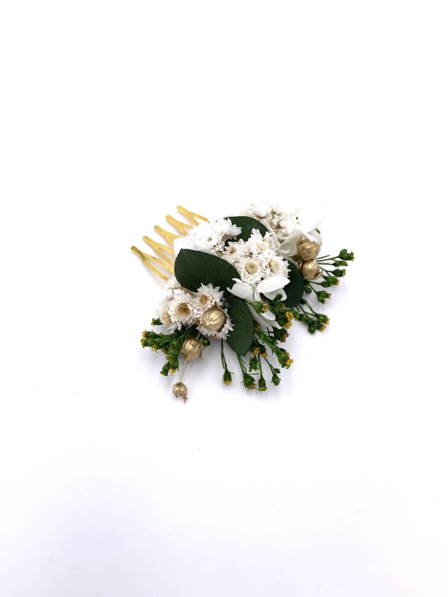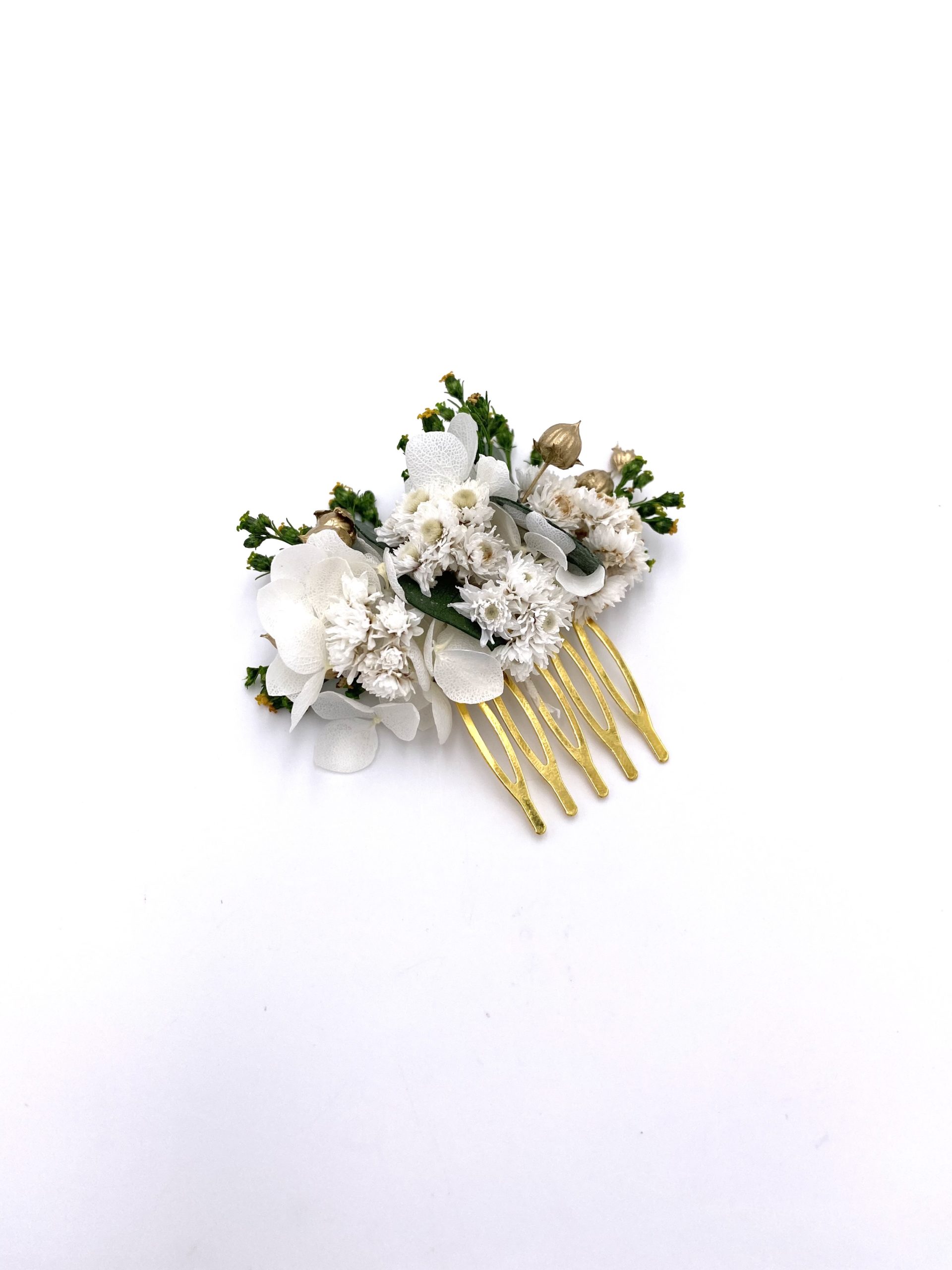 Le peigne Minthé mini en fleurs stabilisées fait partie de la gamme Minthé et de la collection Végétale. C’est un accessoire qui se veut très frais et élégant, combinant le vert doux de l’eucalyptus baby blue avec l’ivoire des immortelles séchées, le blanc immaculé de petits pétales d’hortensia stabilisée et l’éclat de quelques billes de lin séché doré. Cet accessoire de mariage est un peigne en fleurs séchées (immortelles, lin doré) et en fleurs stabilisées (eucalyptus, hortensia, gypsophile).