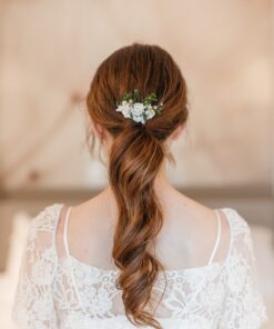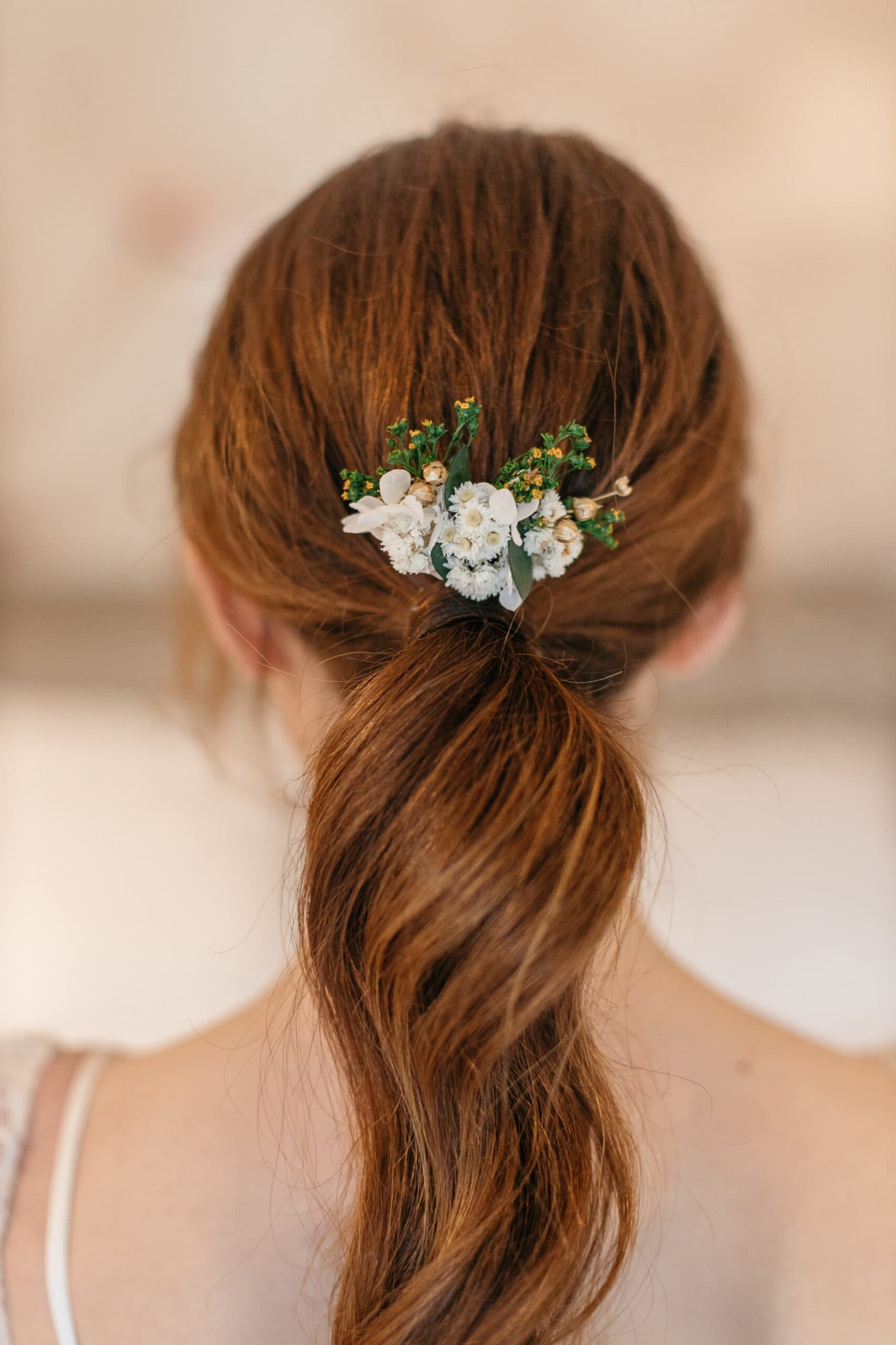 Le peigne Minthé mini en fleurs stabilisées se porte facilement et tient seul sur vos cheveux, permettant une multitude de coupes différentes, sublimant notamment un chignon bas, ou encore une queue de cheval, mais aussi sur le côté.