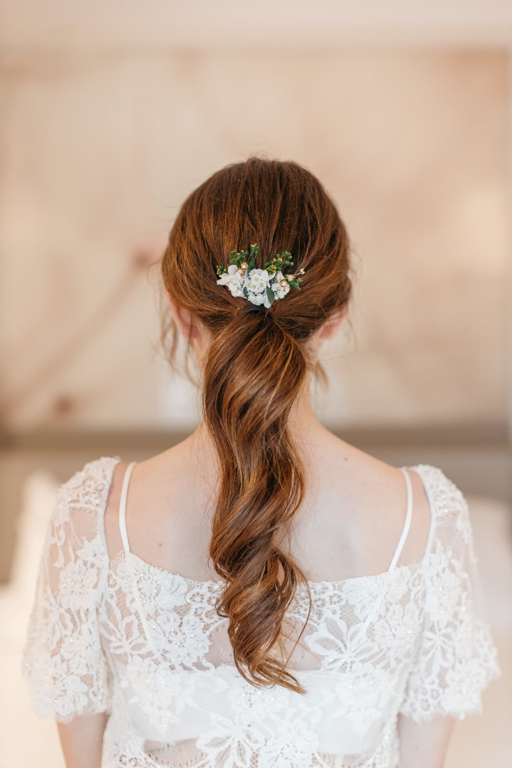 Le peigne de fleurs Minthé, comme tous nos accessoires de la mariée, est confectionné minutieusement à la main en France, en Provence, à partir de fleurs stabilisées et séchées, ces dernières provenant de producteurs français passionnés et spécialisés.