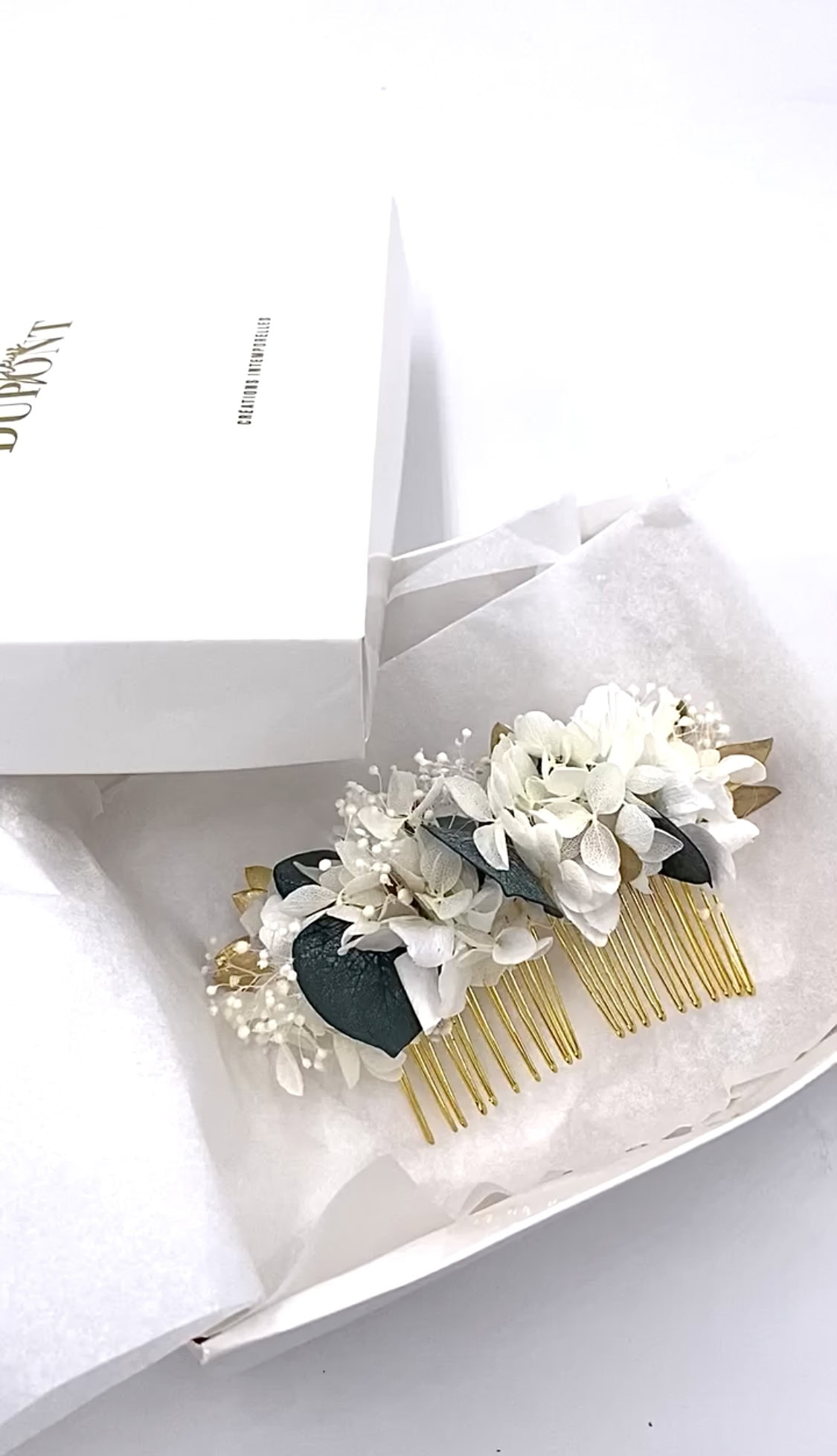 Le peigne de fleurs stabilisées Opaline est un accessoire composé uniquement de fleurs stabilisées, qui comprend deux types d’eucalyptus, avec les feuilles de baby blue au naturel et les feuilles dorées d’eucalyptus parvifolia. Ces tons verts et dorés se marient à la perfection au blanc doux et laiteux des petits pétales blancs de l’hortensia mini stabilisée.