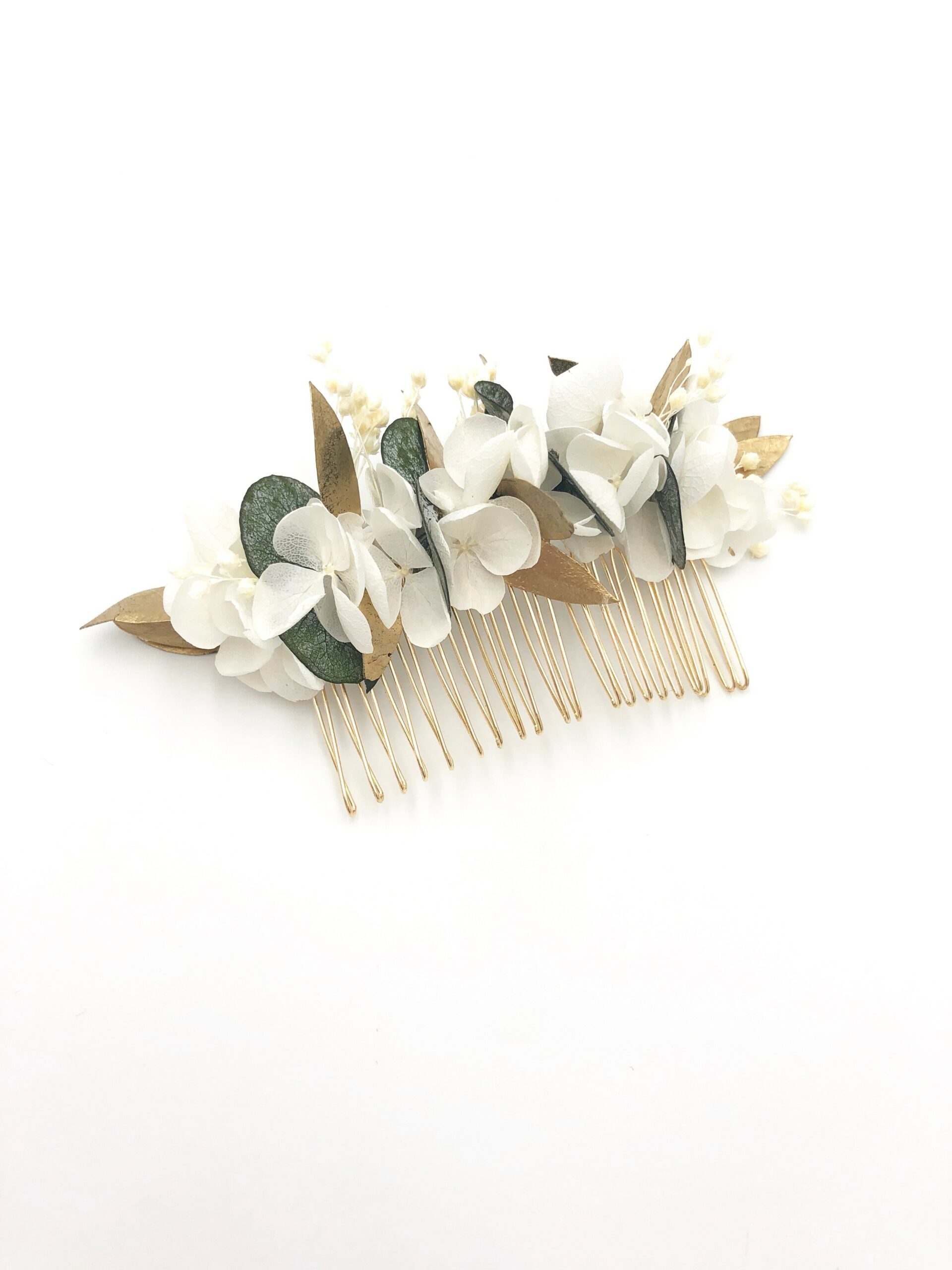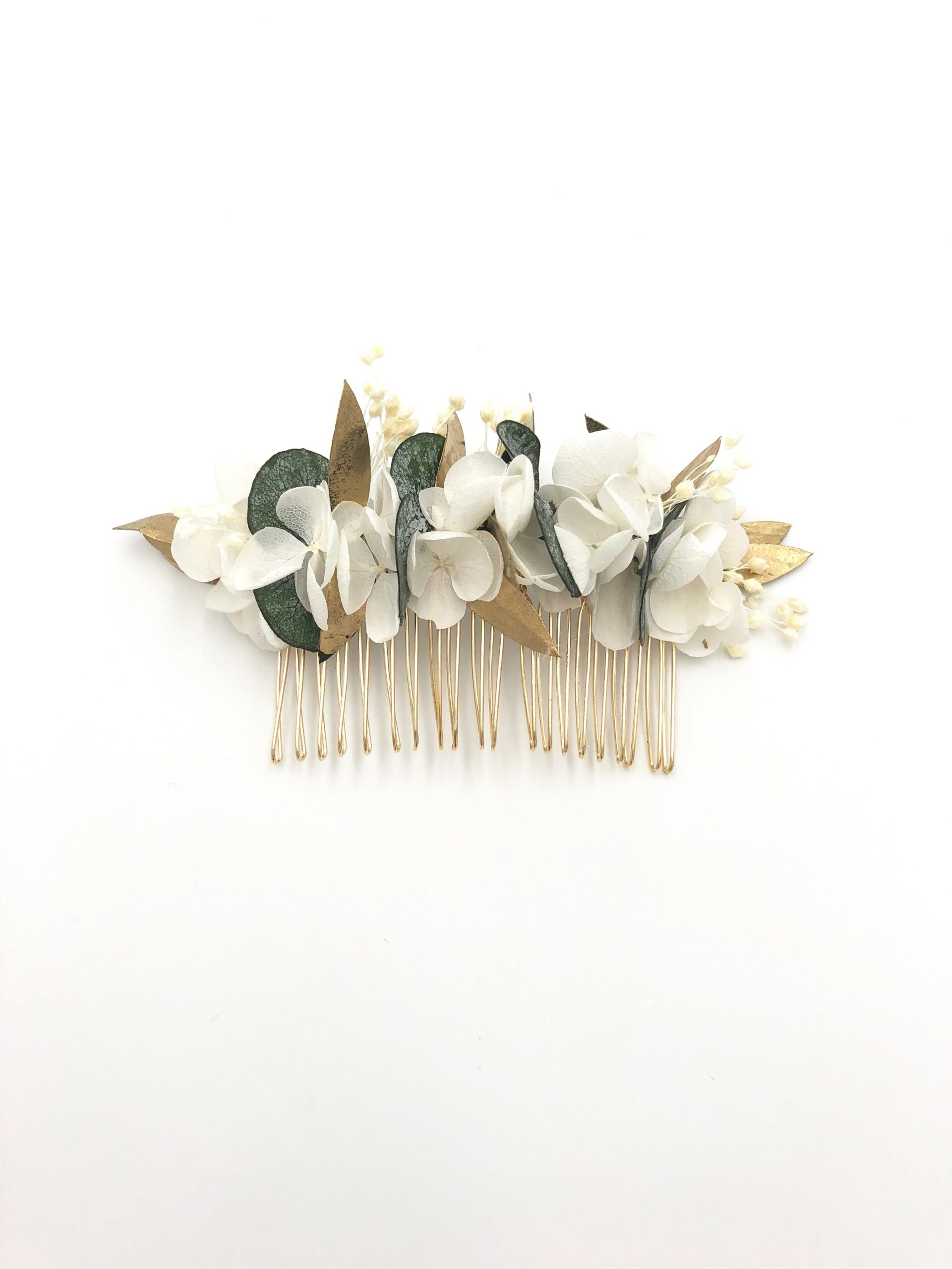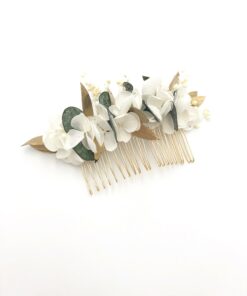Le peigne de fleurs stabilisées Opaline est un accessoire composé uniquement de fleurs stabilisées, qui comprend deux types d’eucalyptus, avec les feuilles de baby blue au naturel et les feuilles dorées d’eucalyptus parvifolia. Ces tons verts et dorés se marient à la perfection au blanc doux et laiteux des petits pétales blancs de l’hortensia mini stabilisée.