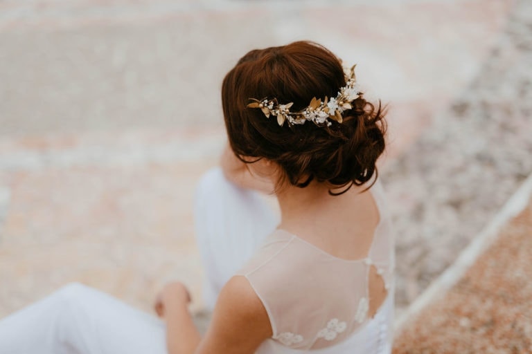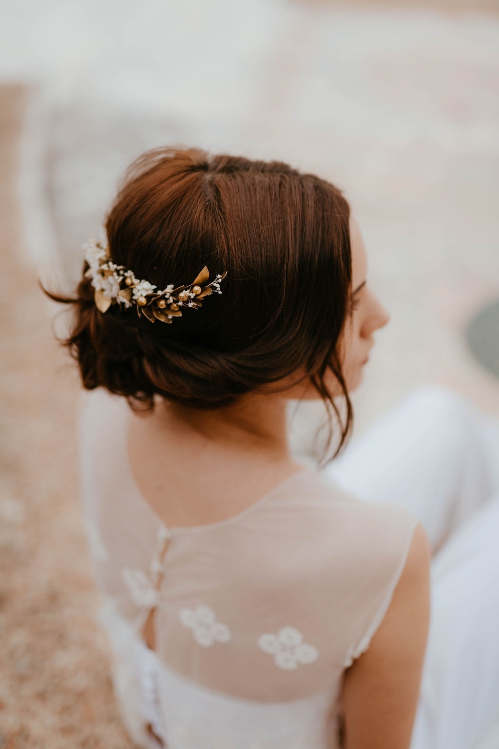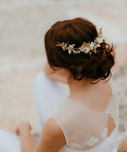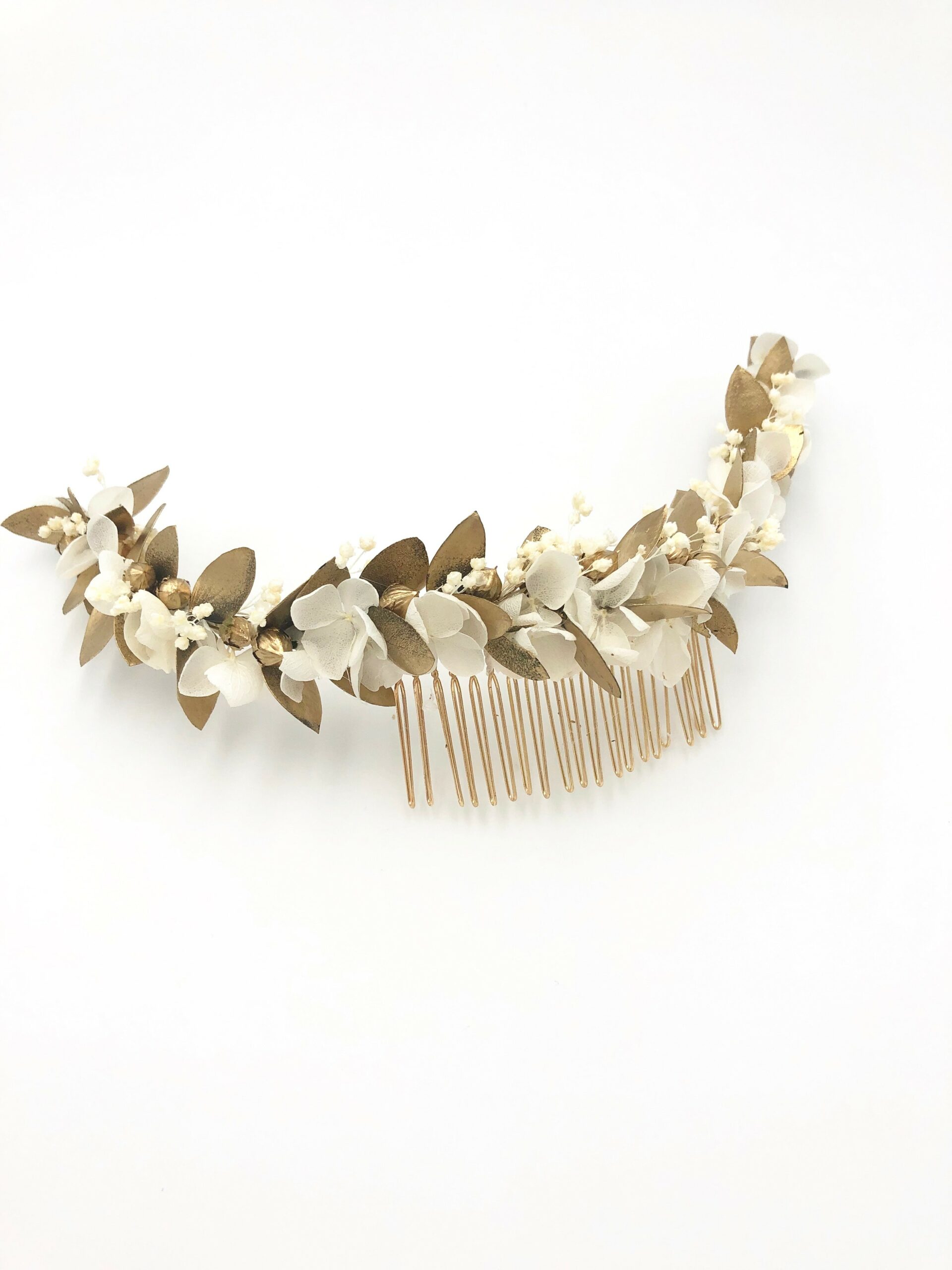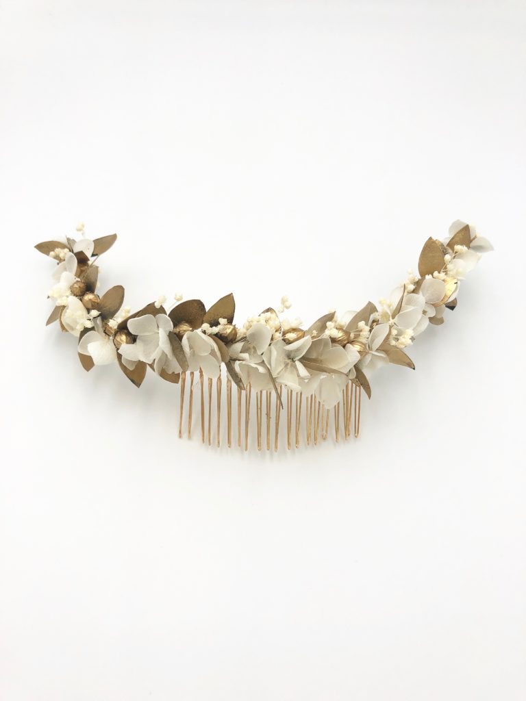 Ce peigne ravira les mariées en quête de la touche fleurie délicate et discrète, qui fasse tout de même l’effet d’un beau bijou de tête aux allures de métaux précieux. Entièrement composé de fleurs naturelles séchées et stabilisées, le peigne de mariée Ori long est réalisé à la main à Lyon à partir de feuilles d’eucalyptus dorées à la main, de billes de lin séché et doré et de délicats pétales d’hortensia blanc. Ce mélange précieux et élégant magnifiera tous les styles de mariées : quelle que soit la robe, quels que soient les cheveux. En effet, c’est un accessoire au chic classique, à l’allure contemporaine et aux tonalités patinées des plus esthétiques.