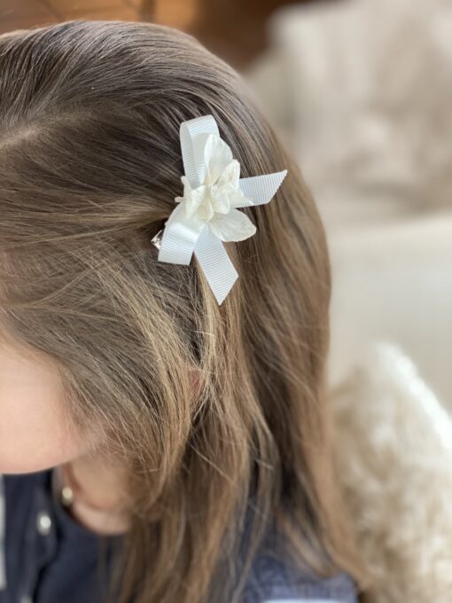 Découvrez notre petite barrette nœud blanche. Nous avons voulu revisiter le petit nœud classique de petite fille en y ajoutant une touche de fleurs !