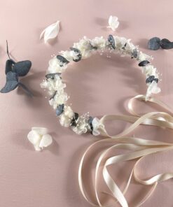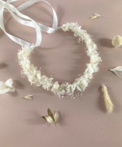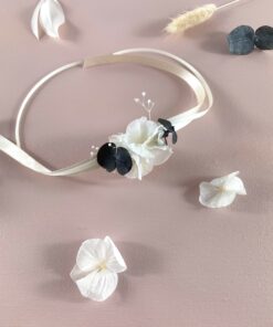La mini barrette en fleurs stabilisées blanche est une création aux accents bohème, mais à l’esprit cérémonie, et pourra s’associer avec goût aux autres accessoires et unifier votre cortège.