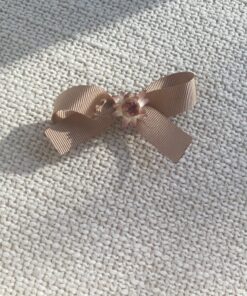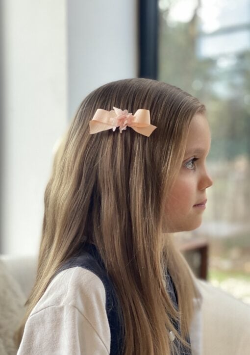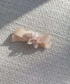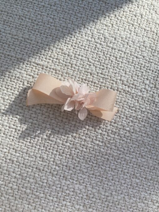 Découvrez notre petite barrette nœud pêche. Nous avons voulu revisiter le petit nœud classique de petite fille en y ajoutant une touche de fleurs !
