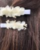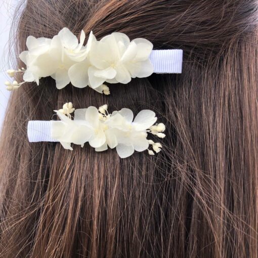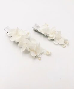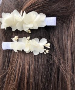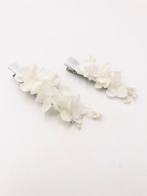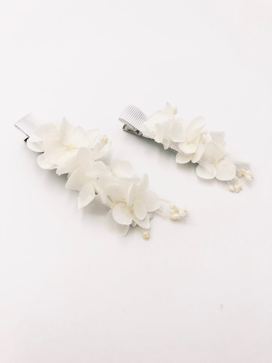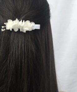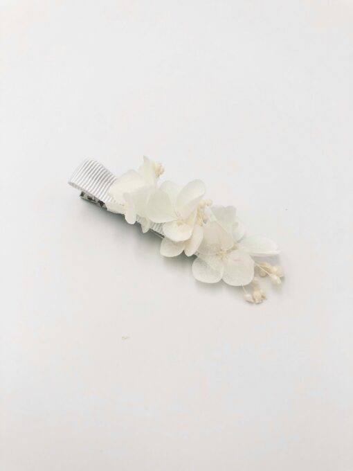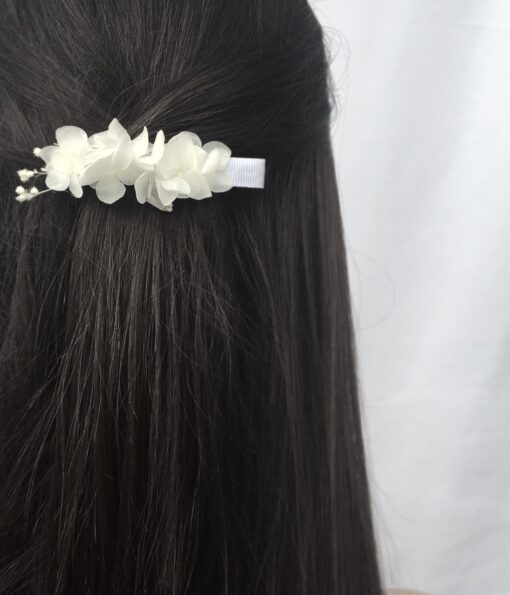 Les Fleurs Dupont vous proposent avec cette petite barrette blanche en fleurs stabilisées, un accessoire pour la demoiselle d’honneur, l’invitée, ou pour la mariée, qui apporte une touche fleurie discrète et élégante, et très facile à porter.