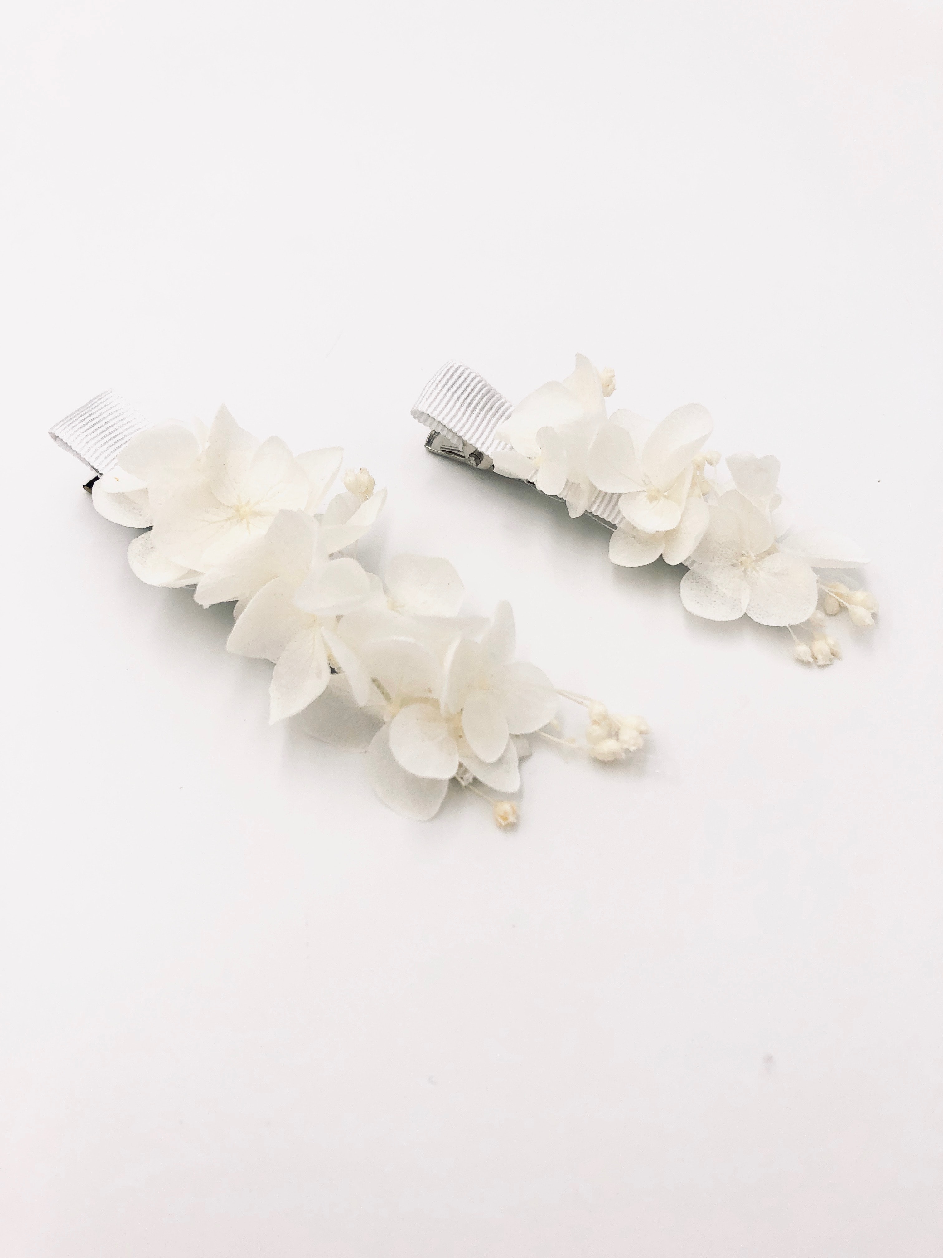 La petite barrette blanche fleurie est une version très immaculée et douce de ces accessoires, qui sublimera instantanément une coiffure, aussi bien sur le côté qu’à l’arrière de la tête. Composée exclusivement de fleurs stabilisées, avec des hortensias blancs et du broom blanc, ce petit accessoire de cheveux est lumineux et délicat.
