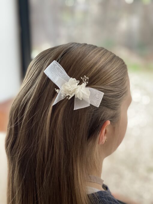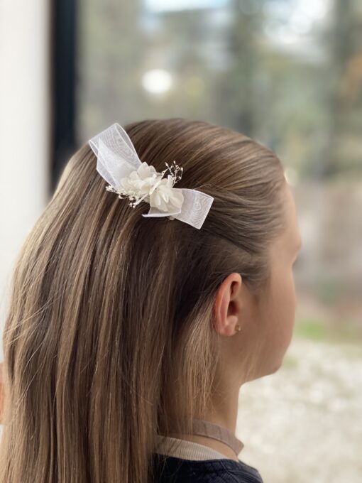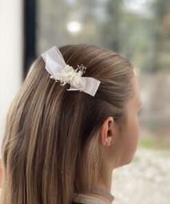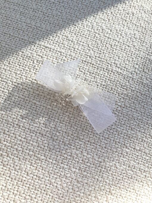 Découvrez notre petite barrette nœud en organza blanc. Nous avons voulu revisiter le petit nœud classique de petite fille en y ajoutant une touche de fleurs !