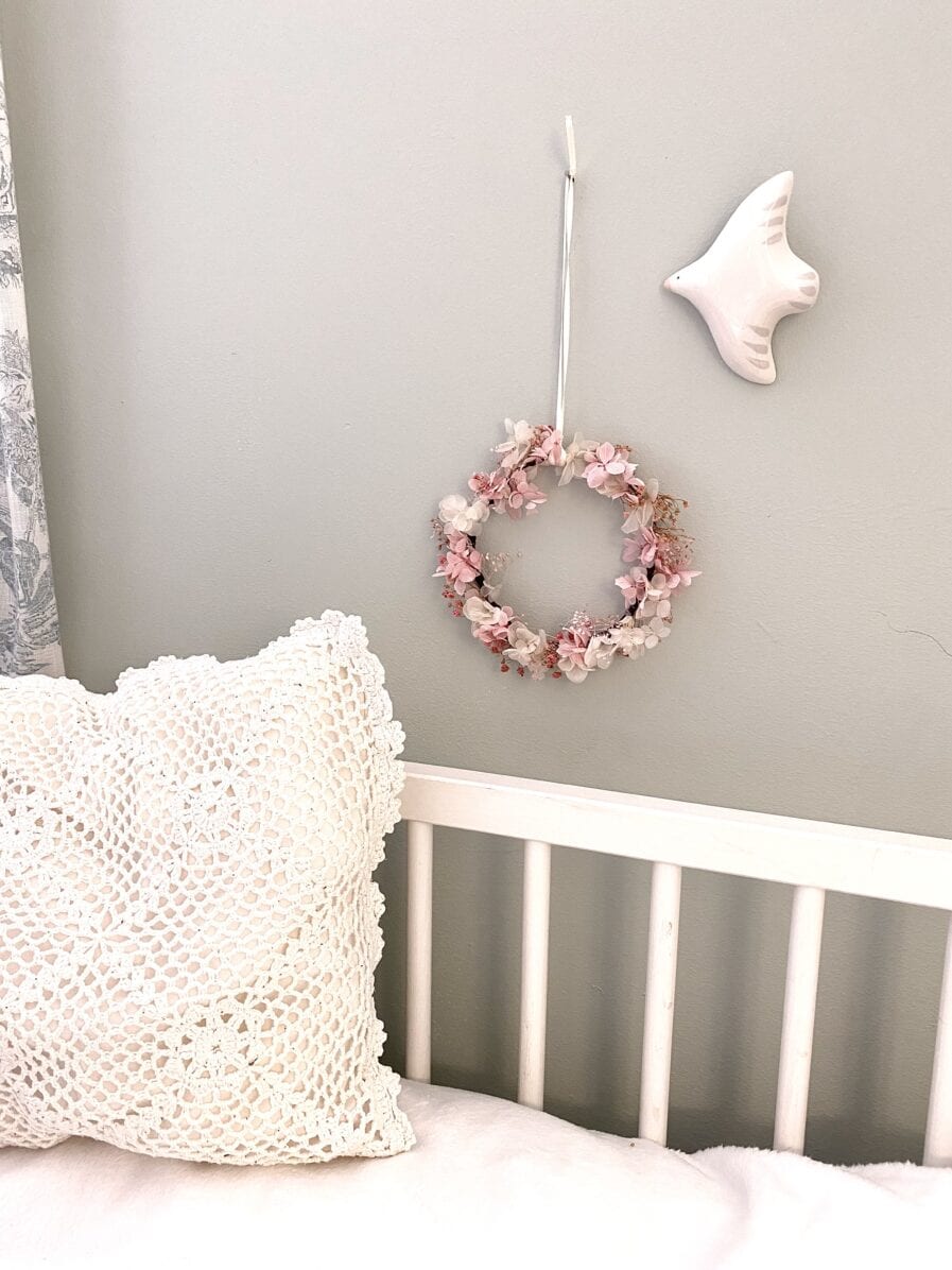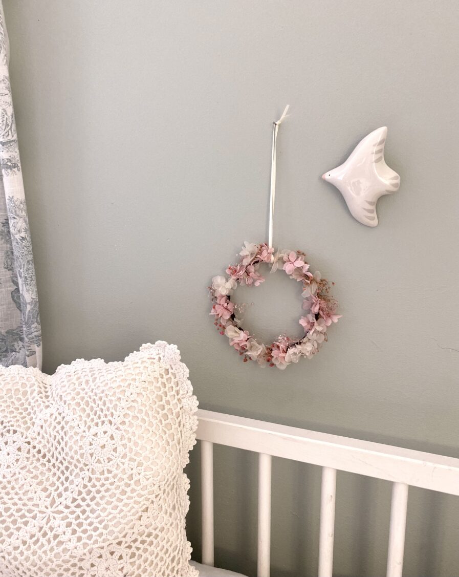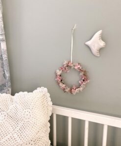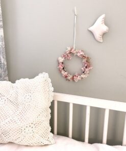 A noter que pour les chambres d’enfants, ces couronnes, étant conçues à partir de fleurs stabilisées, ne dégagent pas de CO2 contrairement aux fleurs fraiches, et sont hypoallergéniques, ne posant donc pas de problème d’éventuelles allergies pour bébé. De plus, contrairement à une idée reçue sur les fleurs séchées, ces couronnes en fleurs stabilisées ne prennent pas la poussière !