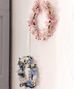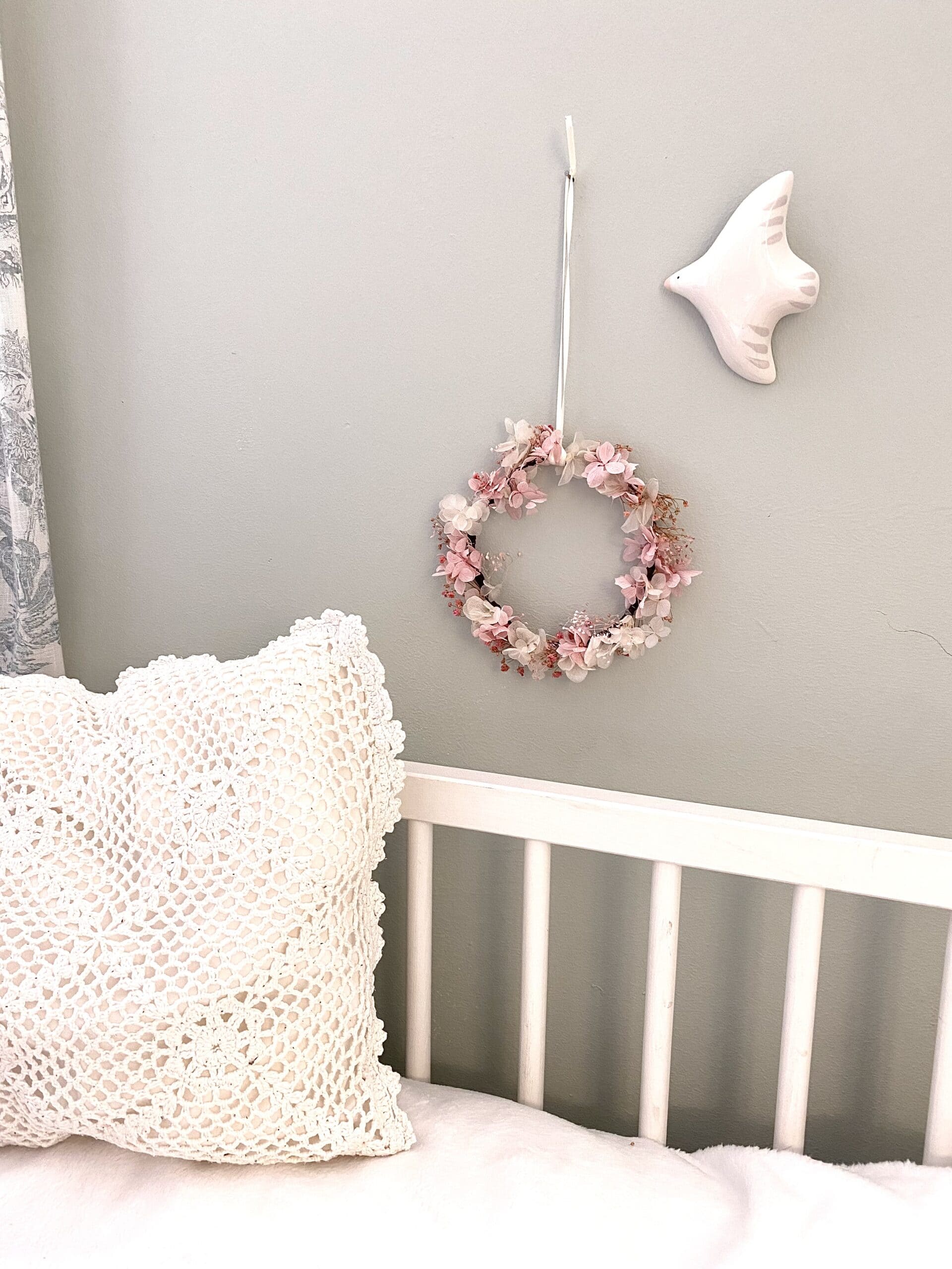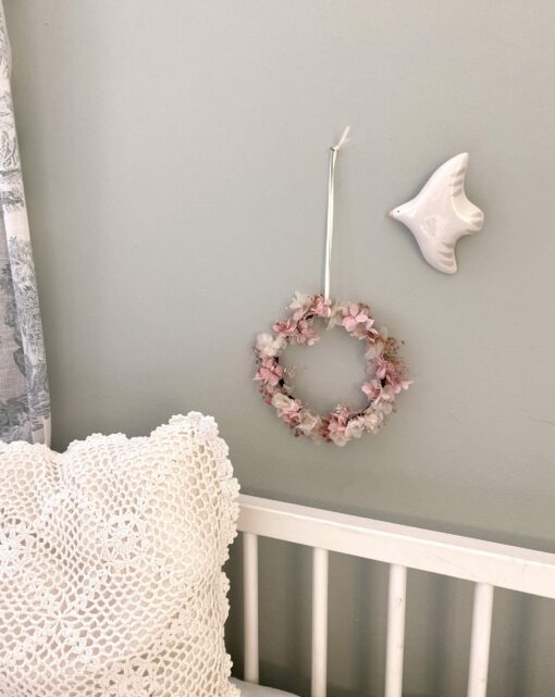 Le modèle Guimauve est une déclinaison douce de nos mini couronnes murales, qui mélange des hortensias ivoire, blanc et vieux-rose, du mini gypsophile rose poudré et du gypso rose, pour un ensemble coloré, féminin et sucré. C’est pourquoi cette couronne déco sera idéale pour mettre en valeur un mur de chambre de bébé, traditionnellement celle des filles, par exemple au dessus de son lit ou de son landeau.