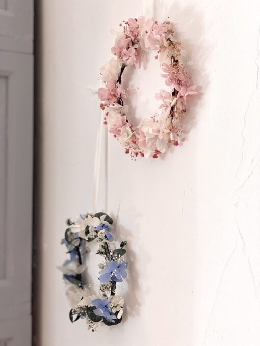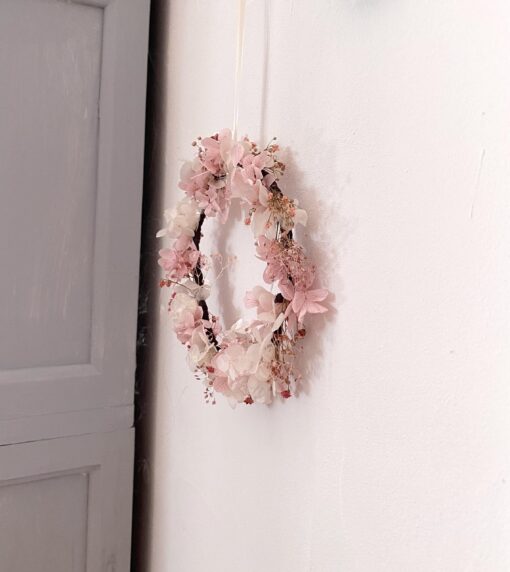 C’est une création artisanale faite main qui utilise des fleurs naturelles stabilisées, qui offrent un aspect frais à cette petite couronne, tout en se conservant plusieurs mois à plusieurs années sans aucun entretien. Il est simplement recommandé d’éviter l’exposition en plein soleil pour ne pas que les couleurs s’estompent au fil des mois. De même, les pièces trop humides de type salle de bains sont à éviter.