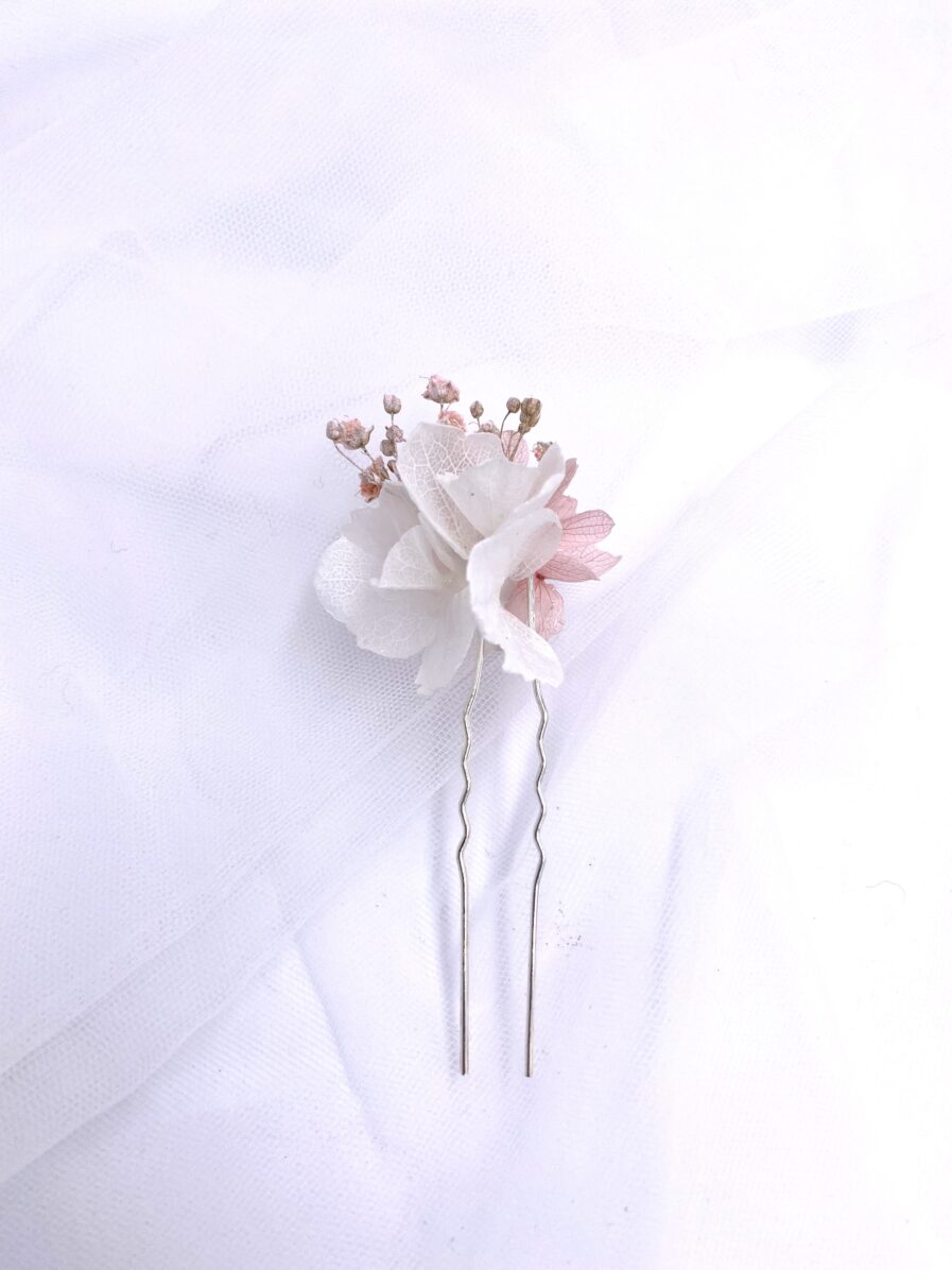 La gamme Candi, et ici les pics à cheveux en fleurs Candi, se compose de fleurs naturelles stabilisées : hortensia mini de couleur blanche et rose, et gypsophile rose pâle. Ce jeu de nuances offre un ensemble en fleurs stabilisées résolument moderne, qui garde toutefois une âme tout à fait romantique et délicate.