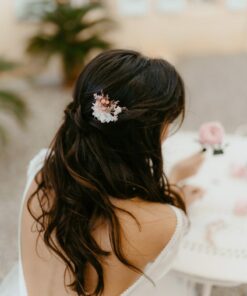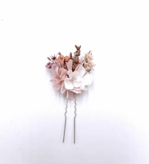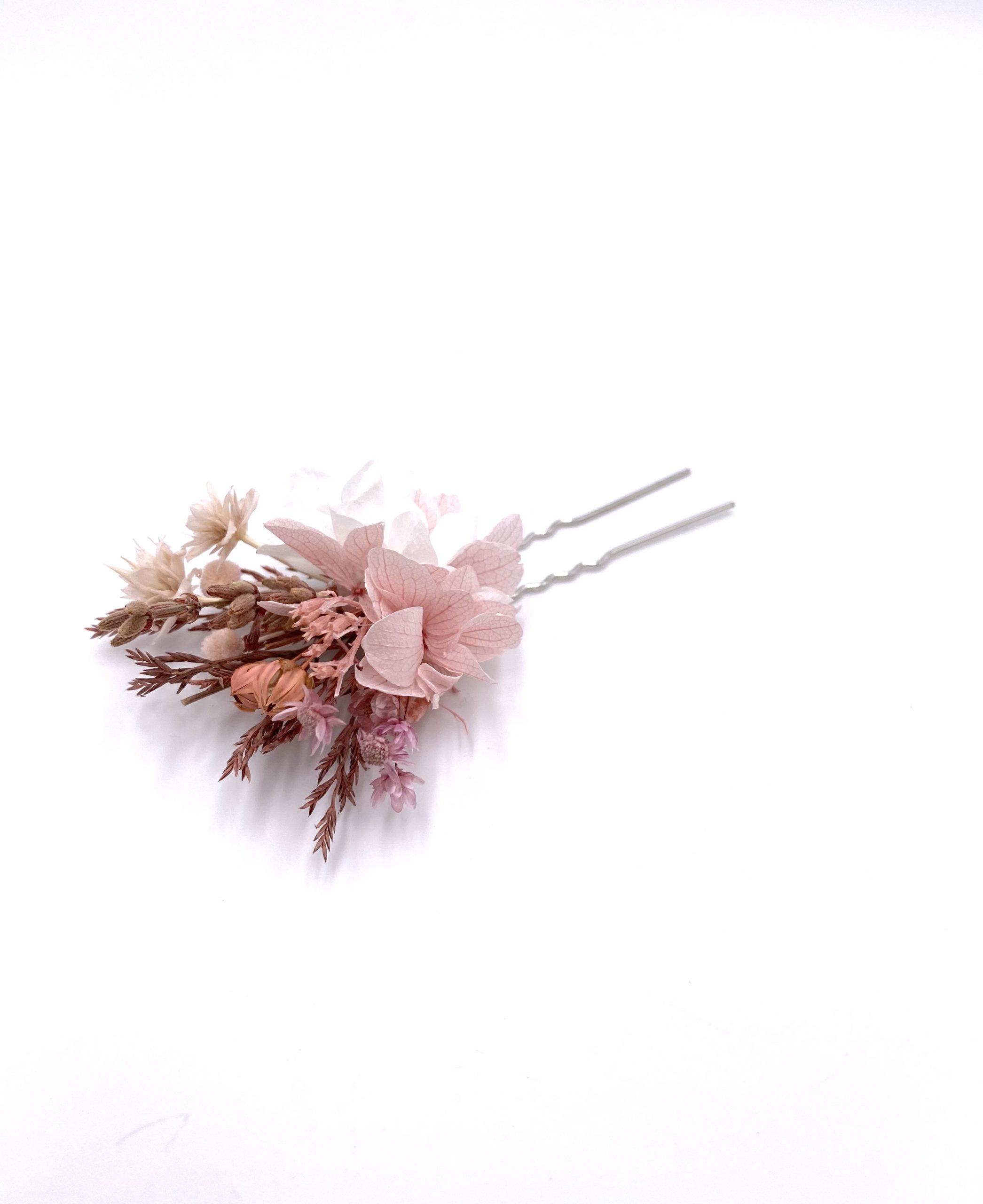 Entre herbes sauvages, hortensias vieux rose, billes de lin, avoines, et gypsophiles, le pic à cheveux en fleurs stabilisées et séchées Chérie fait la part belle aux fleurs délicates et féminines, aux doux dégradés de couleurs, et à une vision romantique et actuelle du mariage.