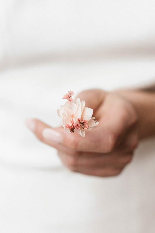 - Fleurs stabilisées naturelles (hortensia mini blanc, rose pâle et rose café, et limonium vieux-rose.)