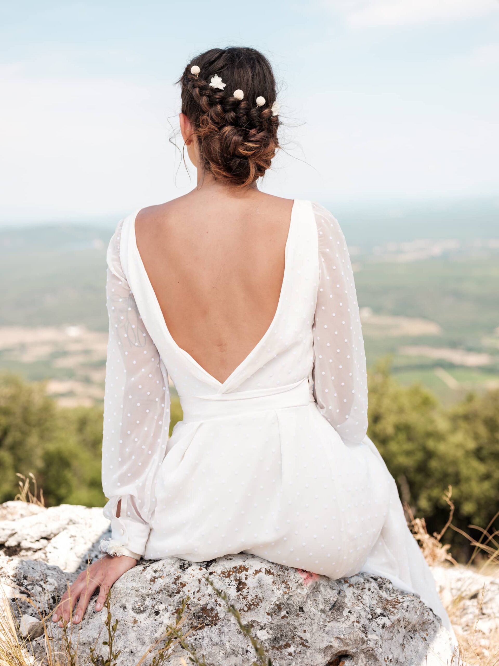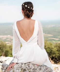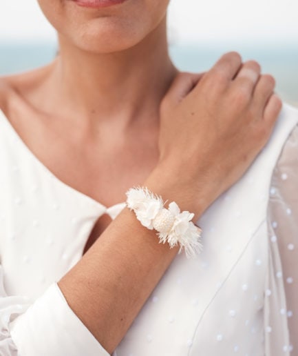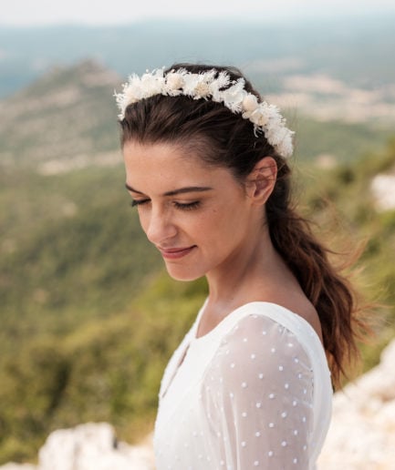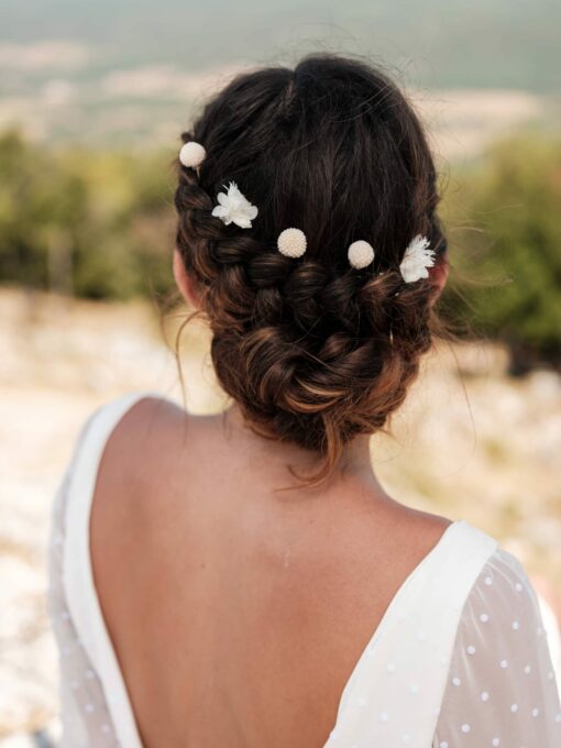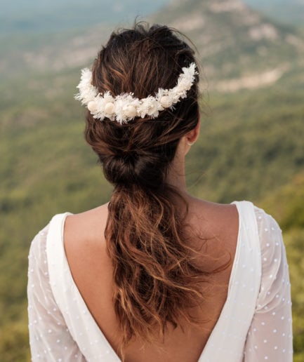 Il s’agit ici du pic à cheveux mélange de fleurs Nimbe, qui fait partie de la collection Horizon, l’une des nouvelles collections pour les mariages en 2020. Avec cette gamme Horizon, Les Fleurs Dupont ouvrent de nouvelles perspectives à l’accessoire de mariage en fleurs, avec une déclinaison particulièrement contemporaine et fraîche en fleurs stabilisées.