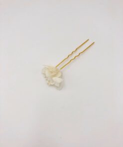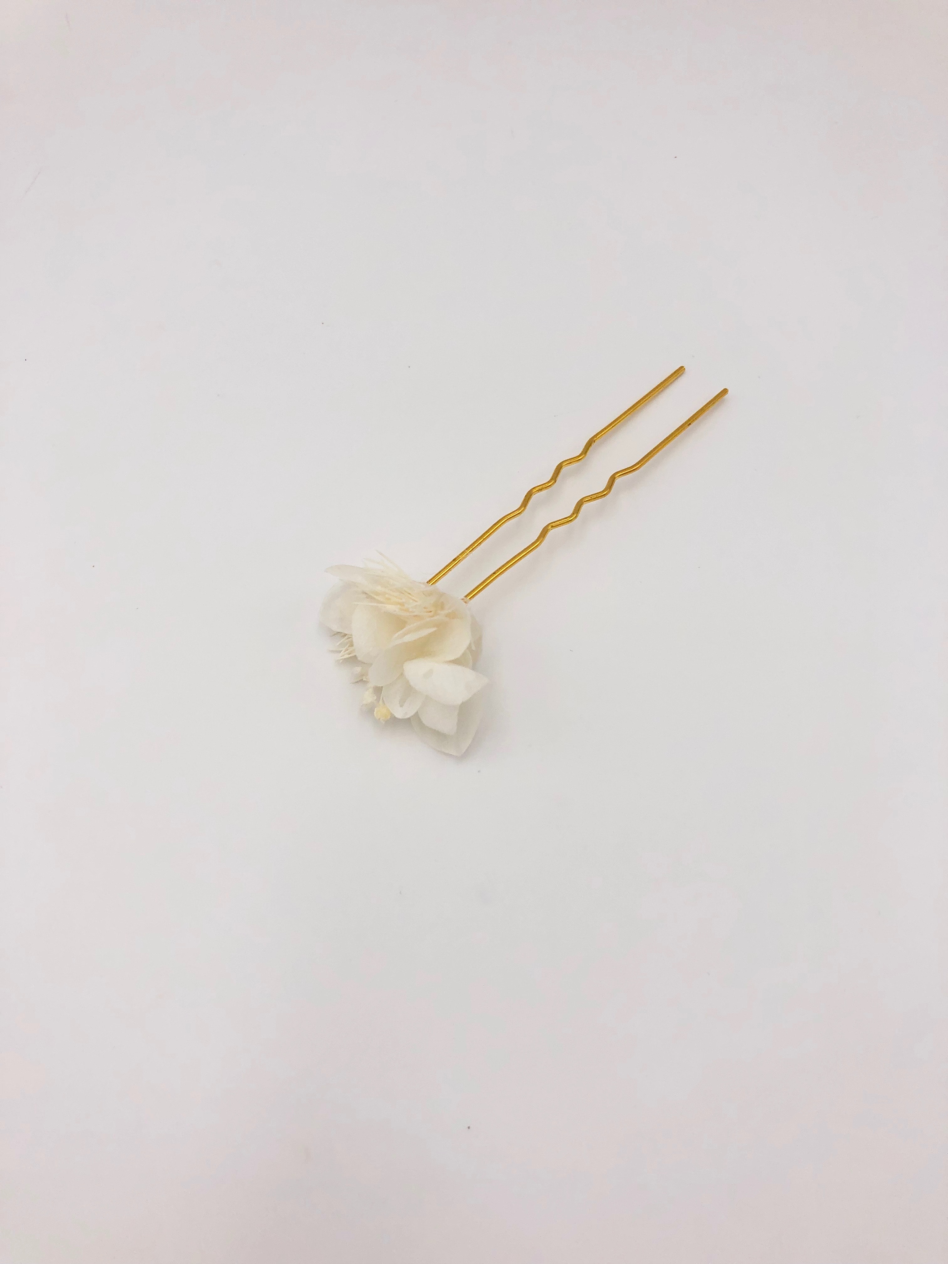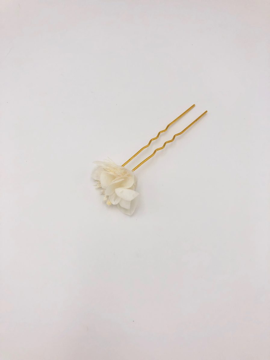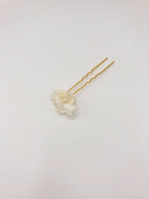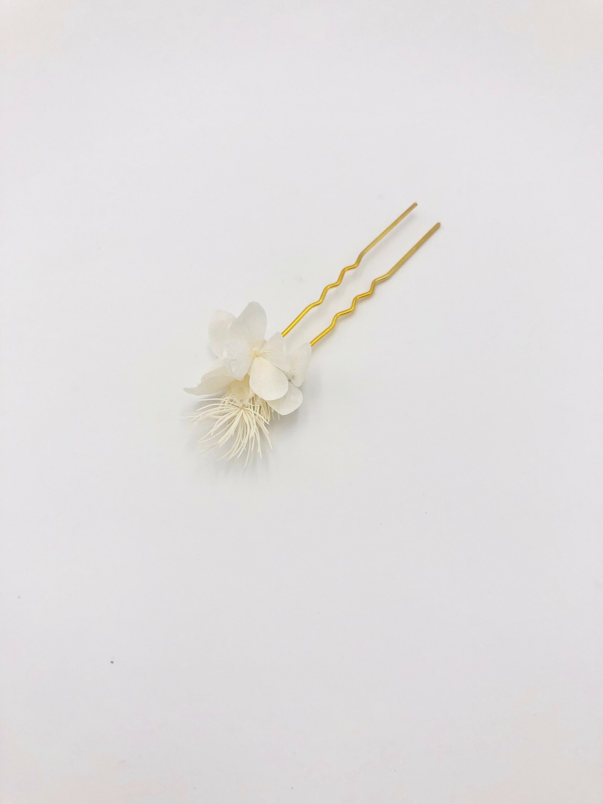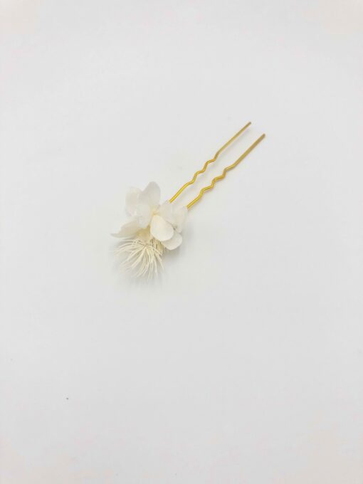 Avec Nimbe, c’est le retour au grand classique, indémodable et chic, c’est l’idée que le mariage n’est pas un événement comme les autres, et qu’il mérite une attention toute particulière, jusqu’à ses moindres détails. Intégralement réalisée en fleurs stabilisées naturelles, la gamme Nimbe et ici le pic à cheveux, comporte des asparagus blancs, des hortensias stabilisés blancs mini et des petites billes de craspedia blanc crème mini.
