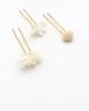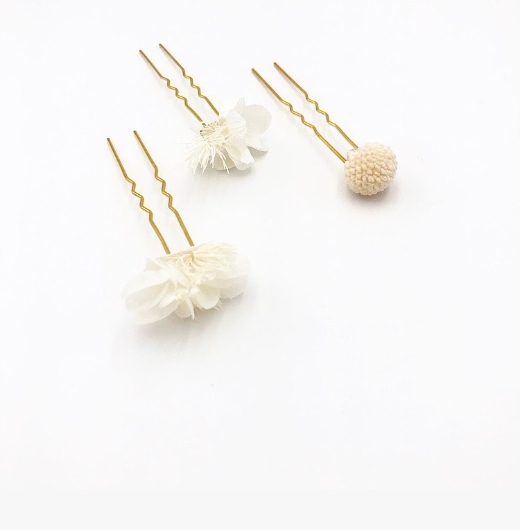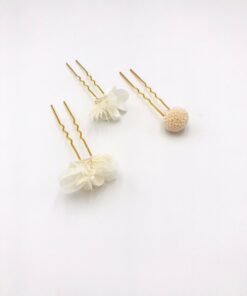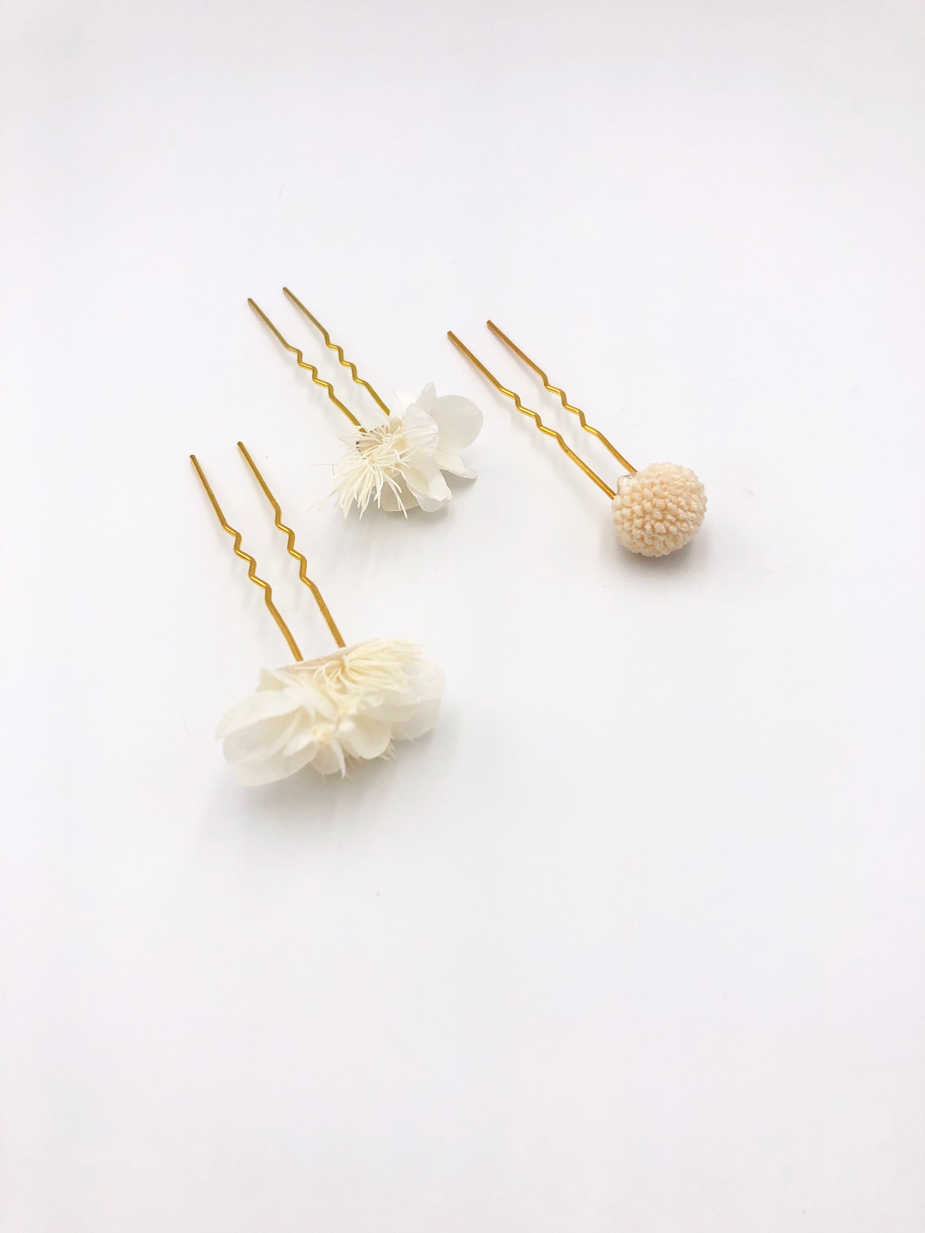 Avec ces pics à cheveux, vous avez la possibilité de composer votre propre ensemble selon votre coiffure et vos envies, en choisissant entre des pics à chignon craspedia, qui sont composés d’une petite bille de craspedia stabilisé de couleur blanche et crème, et des pics à chignon Mélange de fleurs, qui reprennent les différentes fleurs de la gamme Nimbe, sur ces tons nuageux et doux.
